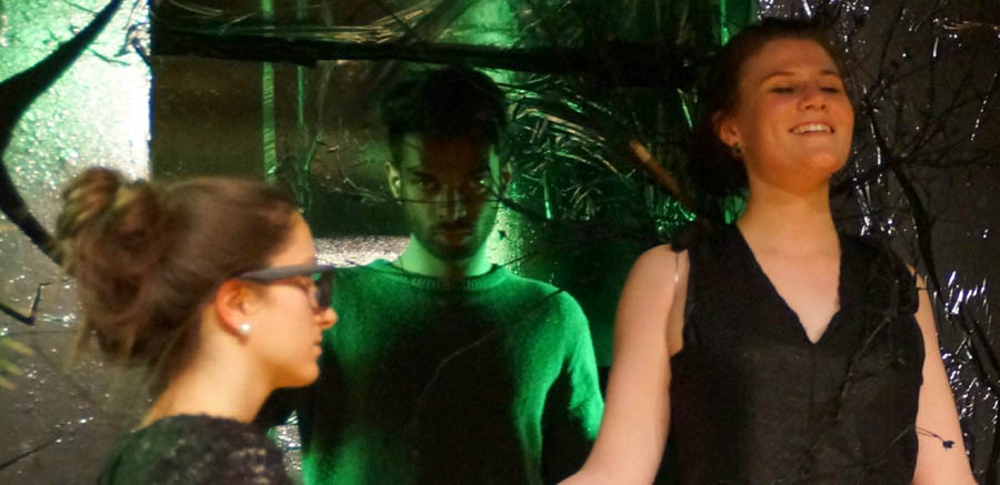 Zudem wird überprüft, ob die Tanzchoreographien, die bisher in den Klassenräumen der Schule oder auf der leeren Aulabühne geprobt wurden, auch tatsächlich in dem fertigen Bühnenbild umgesetzt werden können. Wenn nicht, dann müssen die beiden Tanzgruppen unter der Leitung von Daniela Bongartz und Lena Fürtjes (Waldtänzer) und Pia Hubers und Daniela Liptow (Schlosstänzer) noch einige Tanzschritte umstellen.