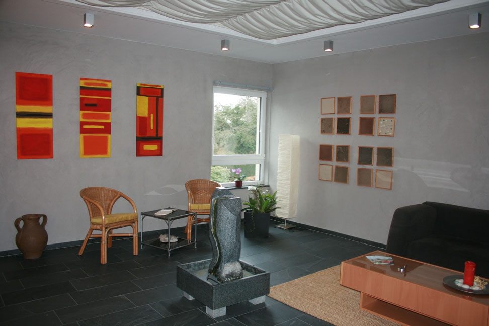 Beim anschließenden Rundgang durch das Haus entdeckten wir an jeder Wand Fotocollagen aus dem Hospizalltag. Auch längst verstorbene Gäste haben hier noch immer ihren Platz. Im Eingangsbereich steht eine Kerze, die angezündet wird, wenn ein Gast verstorben ist. Daneben steht ein großes Glas, das mit Blütenblättern gefüllt ist. Diese Blütenblätter, so erklärte Frau Brünken, legen sie und die Mitarbeiter auf das Bett des gerade Verstorbenen und sammeln sie wieder ein, nachdem dieser das Hospiz verlassen hat. Die Blütenblätter werden in diesem Glas aufgehoben, um sie, wenn das Glas gefüllt ist, in einem kleinen Abschiedsritual gemeinsam im Garten zu verstreuen. Dies war nur eines der Rituale, von dem sie uns erzählte und das untermalte, dass man auch nach 18 Jahren in der Hospizarbeit nicht abstumpft und noch immer um Gäste trauert. Dieses und weitere Rituale, von denen wir erfuhren, notierten wir eifrig, um darüber in unseren Gruppen zu beraten und sie in das zu formulierende Konzept einfließen lassen zu können.