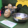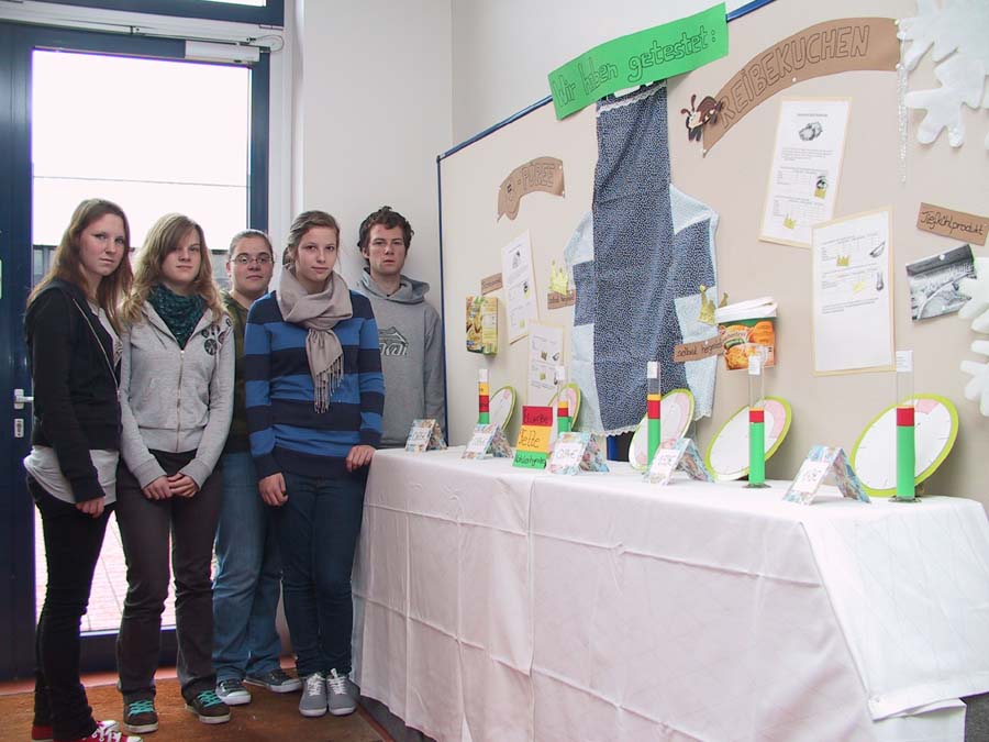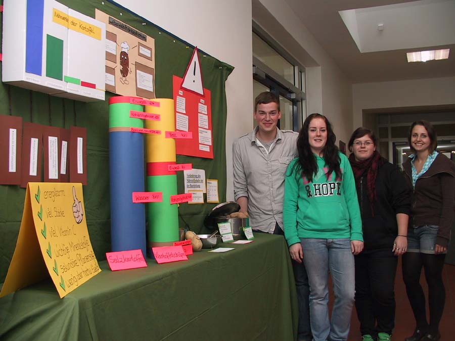 Um 12.00Uhr endlich konnten wir unsere Ausstellung eröffnen und jede Gruppe präsentierte ihre Ergebnisse unserer Lehrerin für Ernährungslehre, Frau Dr. Wirdeier, und unseren beiden Praxislehrerinnen, Frau Lörper und Frau Bissels. Um 13.00Uhr konnten sich dann auch alle Schüler und Lehrer unserer Schule über das Grundnahrungsmittel „Kartoffel“ und ihren vielfältigen Einsatz informieren.