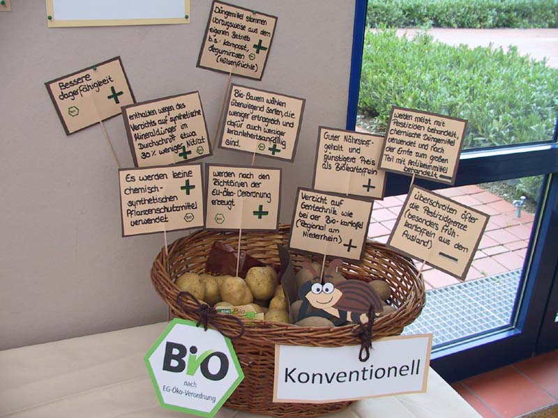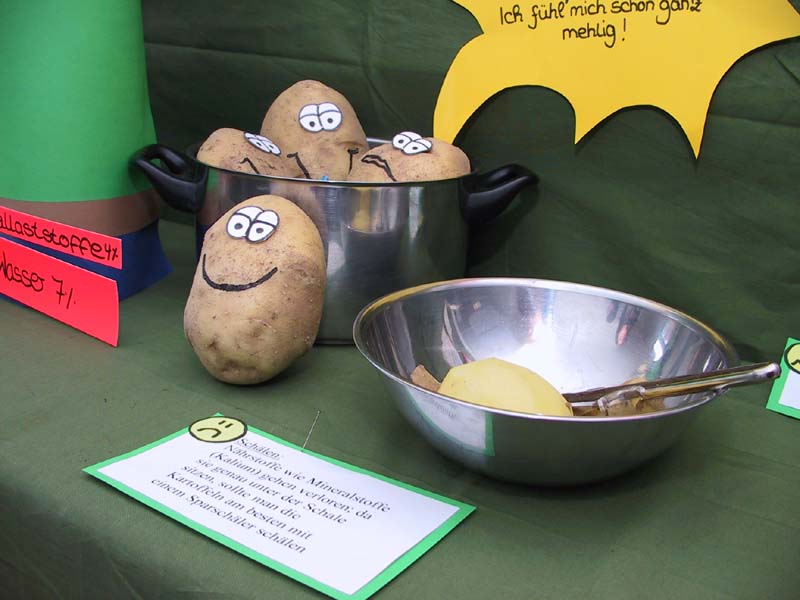 Nachdem wir uns auf das Thema „Kartoffeln“ geeinigt hatten, konnte es auch schon losgehen. Um die Vielschichtigkeit unseres Themas zu zeigen, bearbeiteten wir unser Projekt in fünf Arbeitsgruppen. Dabei setzten wir uns mit dem Kartoffelanbau auseinander, verglichen konventionellen und Bio- Anbau von Kartoffeln, verschafften uns einen Überblick über die zahlreichen Kartoffelsorten und über das große und vielseitige Angebot an Kartoffelprodukten und nahmen den gesundheitlichen Wert von Kartoffeln und Kartoffelprodukten wie Pommes und Chips unter die Lupe. Eine andere Gruppe ging der Frage nach, ob sich die Verarbeitung der frischen Kartoffeln im Haushalt lohnt oder die Reibekuchen aus der Tiefkühltruhe oder das Püree aus der Tüte die zeitgemäßeren Alternativen sind, weil sie Arbeitszeit sparen, nicht teuer sind und so gut schmecken wie selbstgemacht.