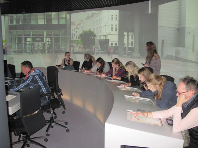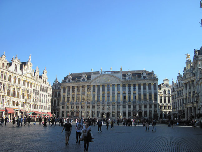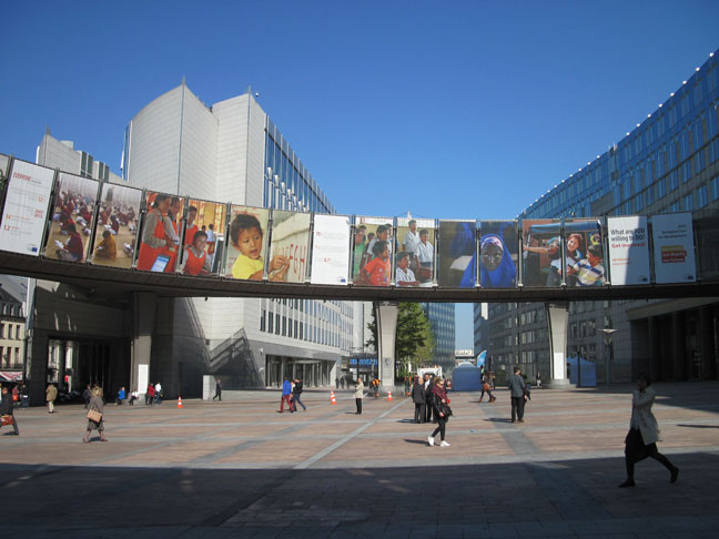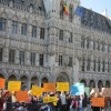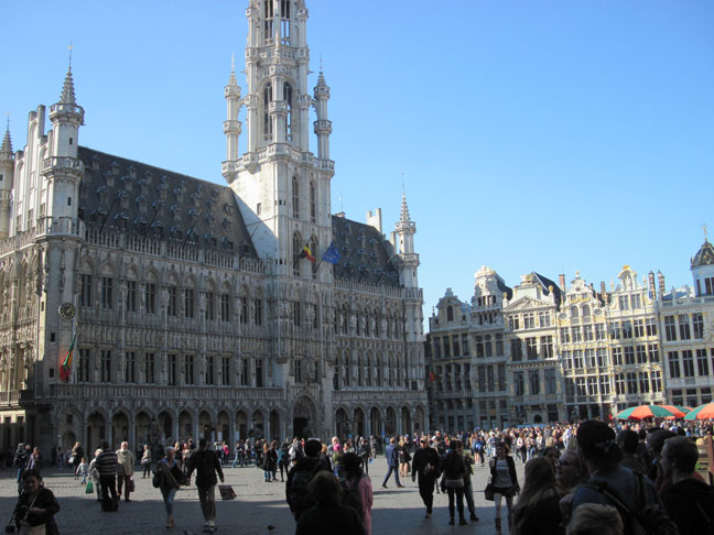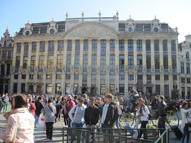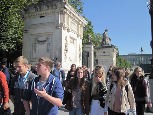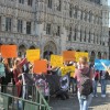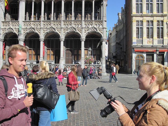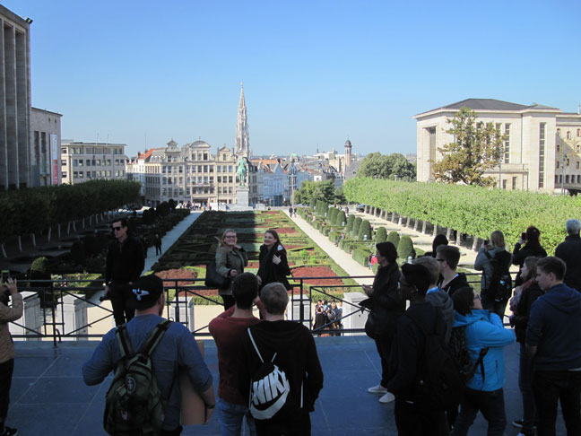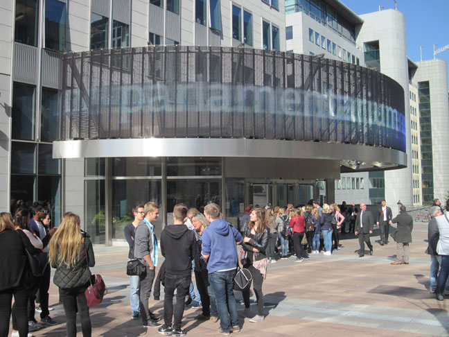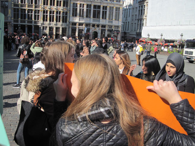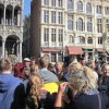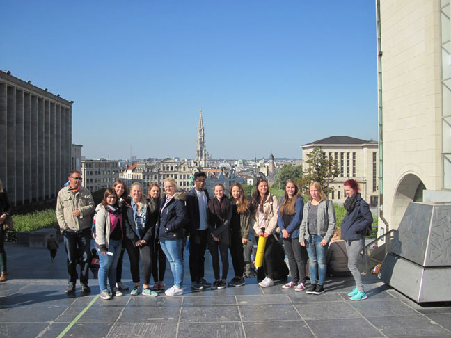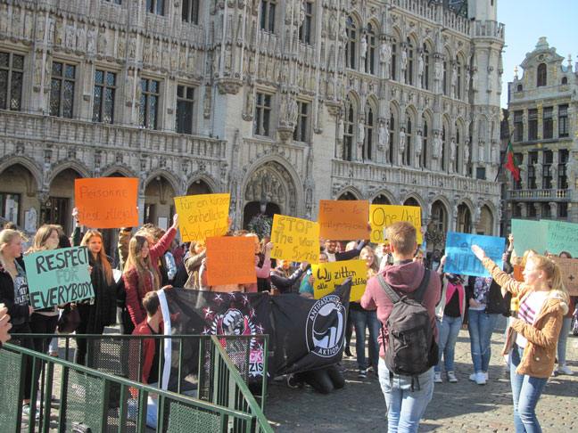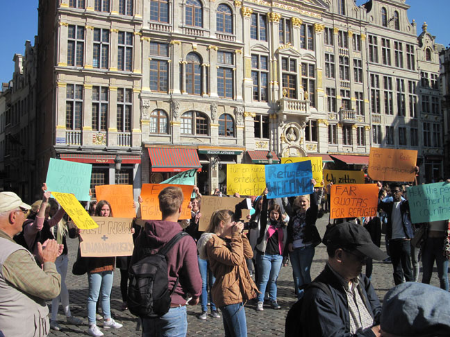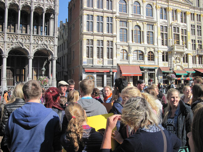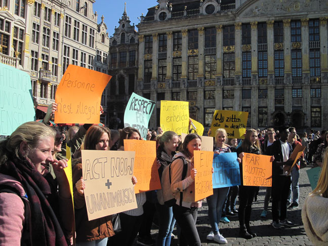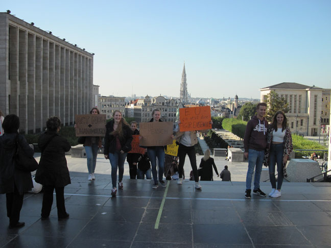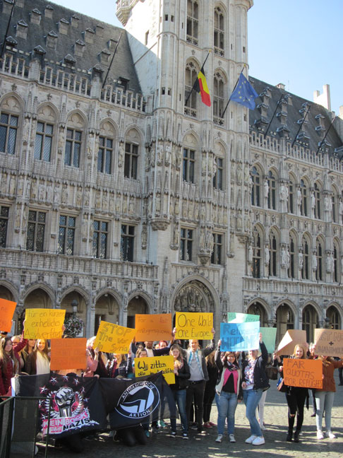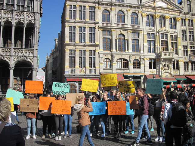 Am 1. Oktober ging es für die AH 13 S 2 und E nach Brüssel. Nach dem Besuch des Parlamentariums und einem Blick auf das Europäische Parlament ging es zu Fuß bei blauem Himmel am königlichen Palast vorbei zum Grand-Place oder Grote Markt, wo eine unangemeldete Demonstration für eine gemeinsame, die Würde der Menschen beachtende, vernünftige und faire Flüchtlingspolitik in der EU abgehalten wurde. Unsere Demonstranten wurden von einigen Touristen angesprochen, fotografiert und so ergaben sich Momente von kurzem, aber lebhaftem Austausch, von Zustimmung und Applaus bis hin zu kritischen Kommentaren. Nach einer Mittagspause zur freien Verfügung ging es wieder zurück zum Palais Royal und von dort mit dem Bus zu einem Abstecher am Atomium für eine kurze Fotosession, allerdings nach einer mühseligen Staufahrt durch die Stadt.