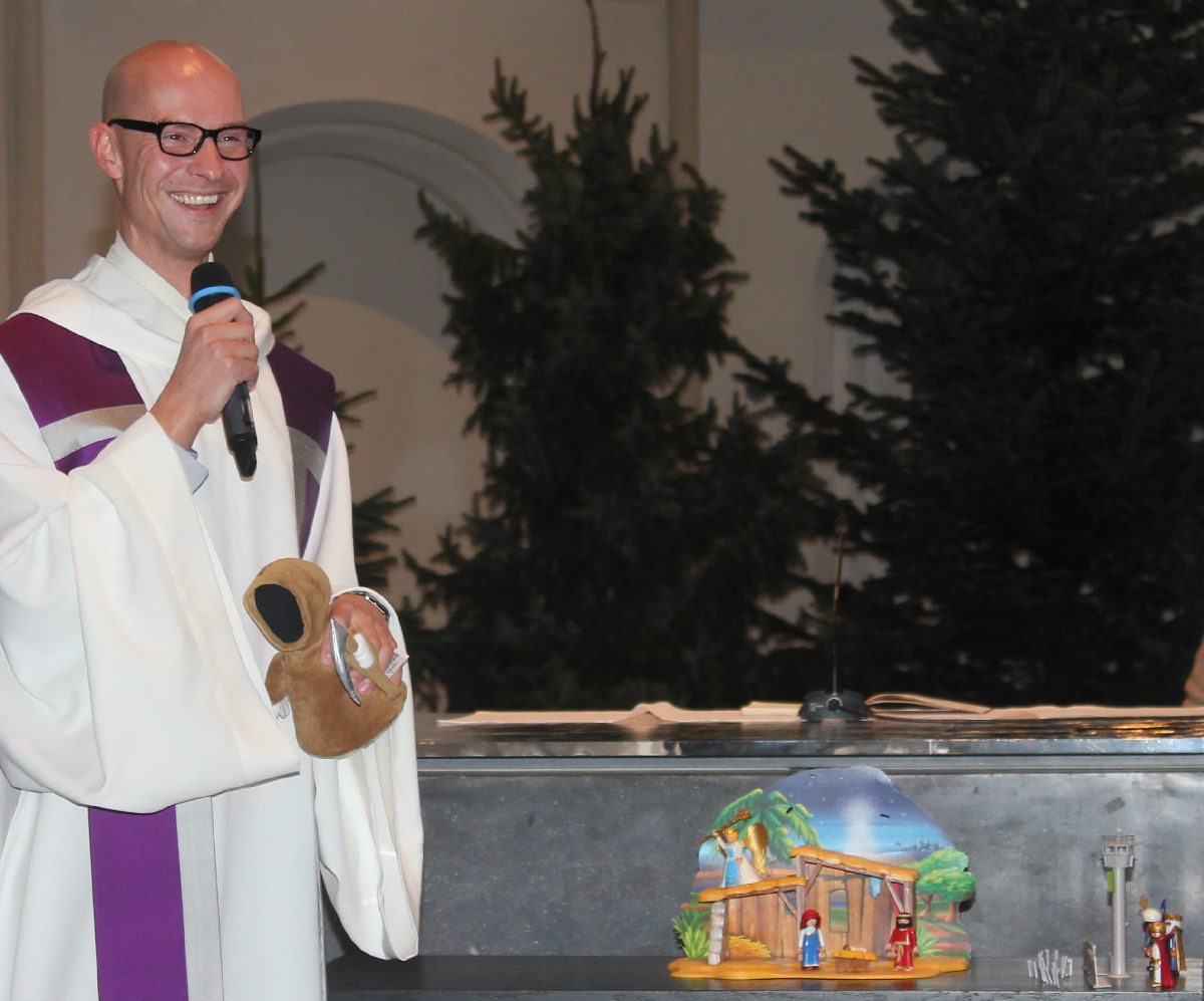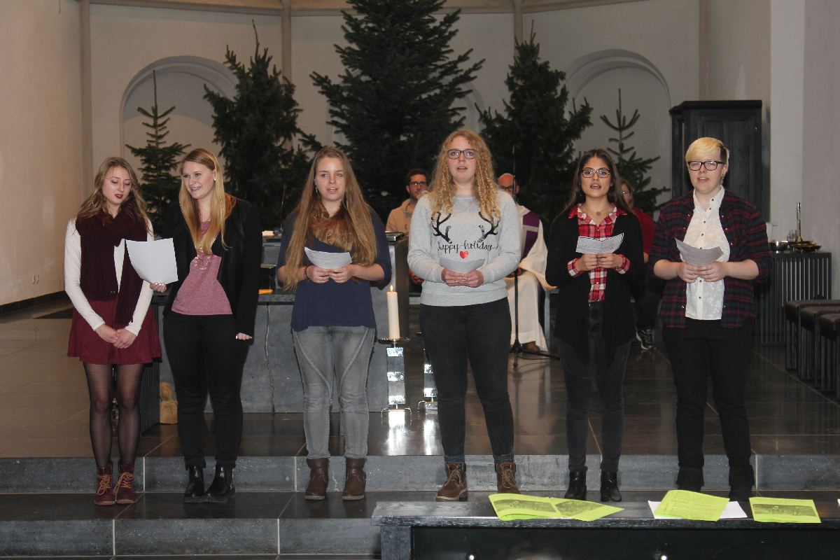 Den Abschluss des letzten Schultages vor den Weihnachtsferien bildete der von der AH/13S1 und Frau Hügens vorbereitete Gottesdienst, der thematisch eindrucksvoll einen Bogen schlug von der Situation, der Maria, Josef und Jesus vor 2000 Jahren ausgesetzt waren, und den Bedingungen der heutzutage Flüchtenden nach Europa.