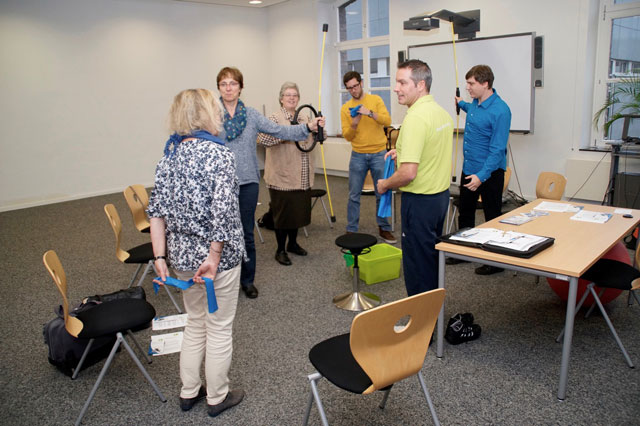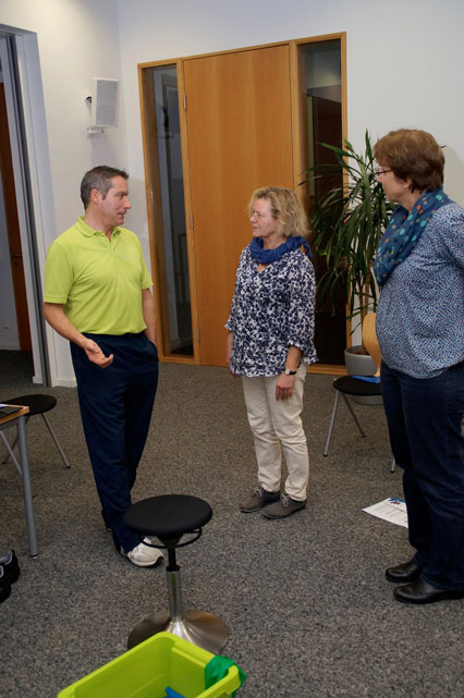 Daneben gab es auch viele Praxisanteile, in denen Herr van Hees den Teilnehmerinnen und Teilnehmern die Möglichkeit bot, Lockerungs- und Kräftigungsübungen am eigenen Leib zu erproben. Mit Hilfe von Materialien wie Thera-Band, Pezzi-Ball oder Flexi-Bars wurden einfache Übungen durchgeführt, die auch zu Hause auf unkomplizierte Weise in die Heimarbeit eingebunden werden können. Sie sollen dabei helfen, schmerzhaften muskulären Verspannungen vorzubeugen. Das Einhalten regelmäßiger Pausen in Kombination mit abwechslungsreichen Tätigkeiten ist jedoch Voraussetzung hierfür.