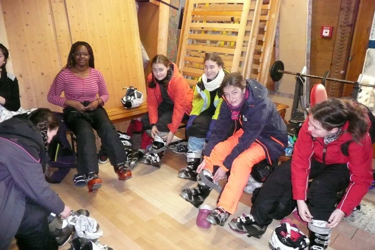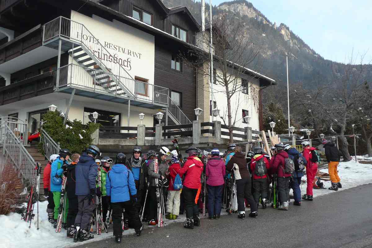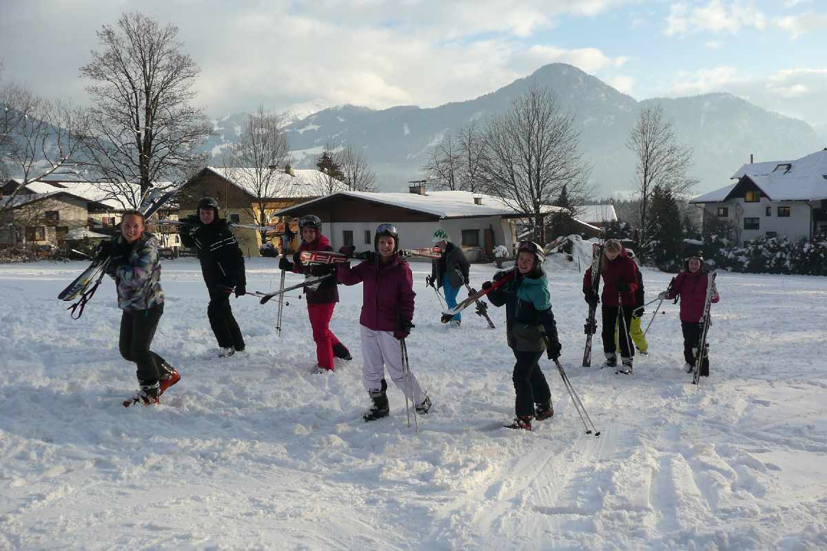 Die ganze Sache hatte aber einen Haken: Unser Doppeldecker mitsamt großem Hänger konnte deshalb nicht direkt bis zu unserem Gasthaus vorfahren, so dass jeder sein Gepäck selber den Hang hinaufbefördern musste. Uff! Und es kam noch schlimmer. Nachdem die Gruppe in Kramsach mit Skiern, Stöcken, Schuhen und Helmen ausgestattet worden war, musste nun diese sperrige Ausrüstung auch noch einige hundert Meter zur Unterkunft hochgetragen werden. Nun war jedem klar: Skifahren ist nicht nur Zuckerschlecken und Herumwedeln auf bestens präparierten Pisten bei strahlendem Sonnenschein, sondern hat auch viel mit Kraft und Ausdauer zu tun.