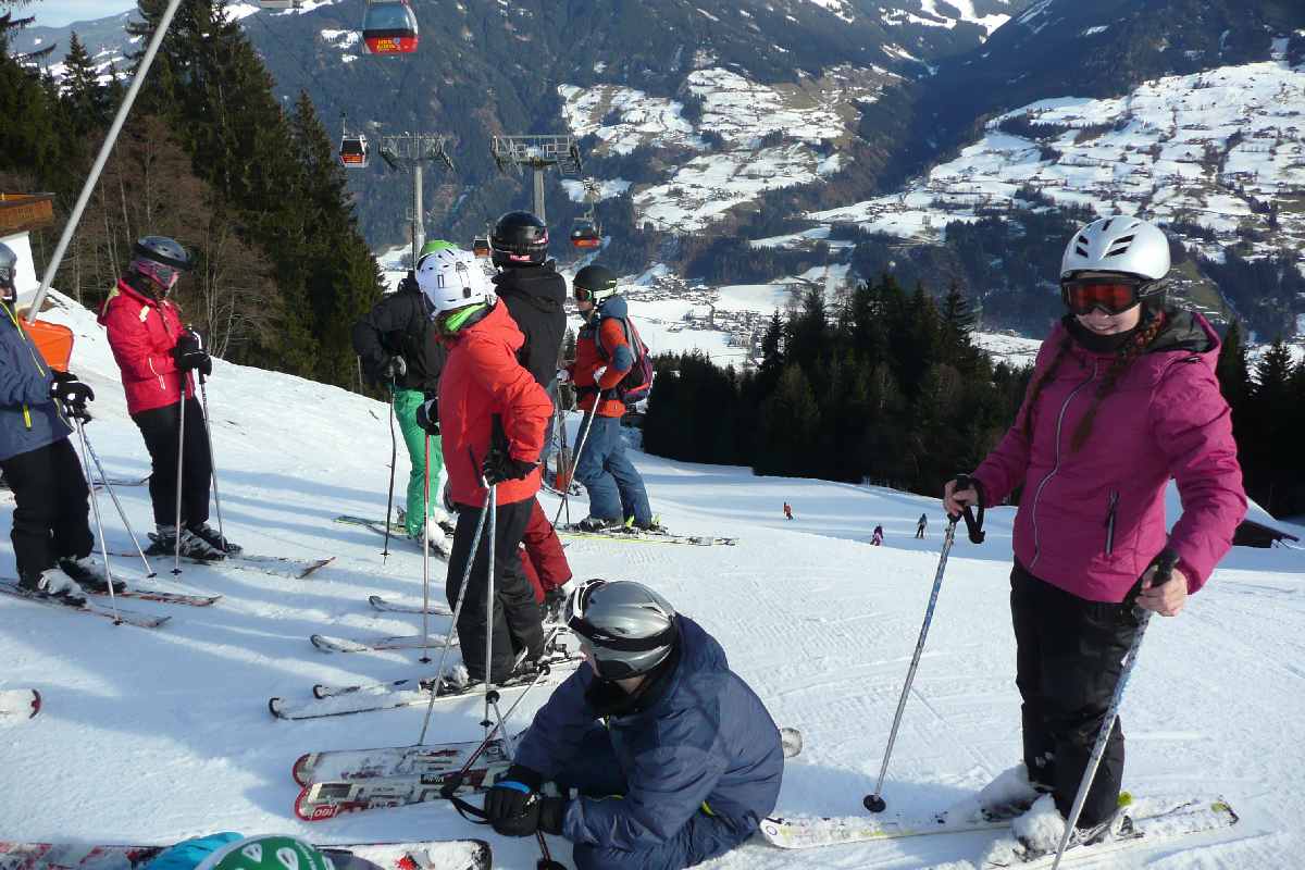 An den folgenden Tagen, an denen immer heiter bis wolkiges und trockenes Skifahrerwetter herrschte, hieß es dann früh aufstehen. Spätestens um halb 9 stand der Skibus vor der Tür, um alle aus unserer Gruppe, zusammengepfercht wie Ölsardinen in der Dose (Devise: Umfallen unmöglich), zur Gondelbahn in Kaltenbach zu fahren. Oben in den Bergen standen uns dann von leicht blau bis zu schwarz alle Schwierigkeitsgrade von Pisten zur Verfügung.