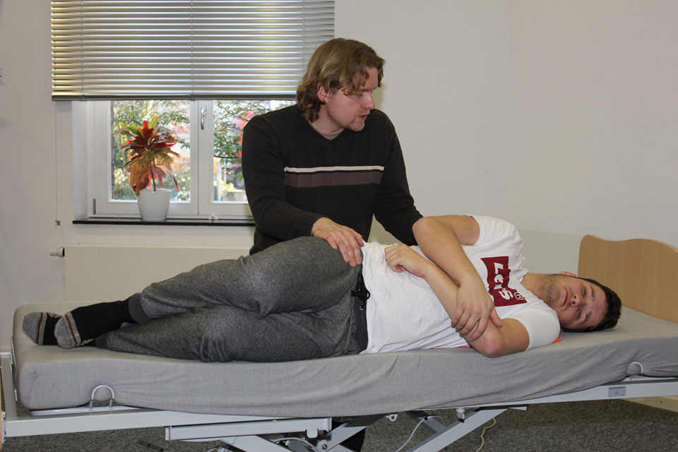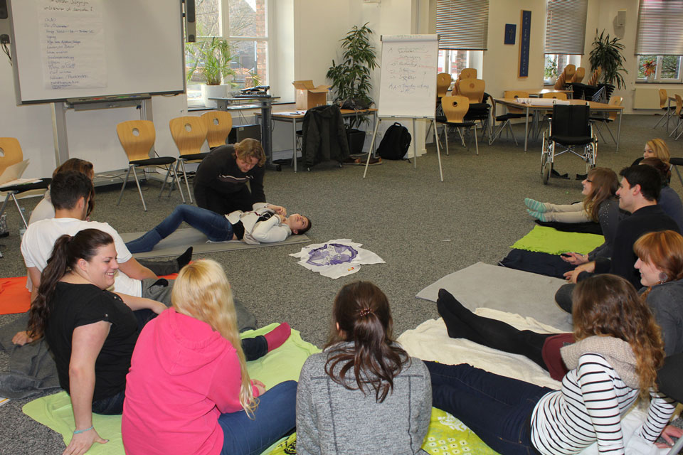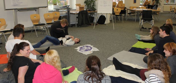 Die Durchführung von Bewegungen unter Einbezug kinästhetischer Prinzipien erklärte Herr Vermöhlen eindrucksvoll anhand vieler praktischer Übungen aus dem heilerziehungspflegerischen Berufsalltag. Zu nennen sind hier zum Beispiel die Mobilisation vom Bett an die Bettkante, von der Bettkante in den Rollstuhl und das so genannte Lagern im Bett. Jede Bewegung und jeder Transfer wird dabei so gestaltet, dass der Klient die Selbstkontrolle über das Geschehen hat. Das bedeutet, dass die gemachte Bewegungserfahrung nachvollzogen und der eigene Körper als wirksam erfahren werden kann. Die Bewegung der Klienten wird schonend unterstützt und die Motivation des Klienten durch die Kommunikation über Berührung und Bewegung deutlich verbessert.