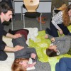 Mit eben jenen Prinzipien und mit den Grundlagen zur Anatomie und Physiologie des Bewegungsapparates beschäftigten sich die Teilnehmer/innen im ersten größeren Block dieses Kurses. Zum Verständnis der Prinzipien knüpften die Teilnehmer/innen an Vorwissen an bzw. bauten dieses speziell zur Funktionsweise der Sinne (kinästhetisches Sinnessystem), zu den Bewegungselementen und zu Interaktionsformen aus. Darüber hinaus wurde der Aufbau und die Funktionsweise von Knochen und Muskeln ebenso wiederholt wie neues Wissen zu Massen und Zwischenräumen sowie Haltungs- und Transportbewegungsebenen erworben.