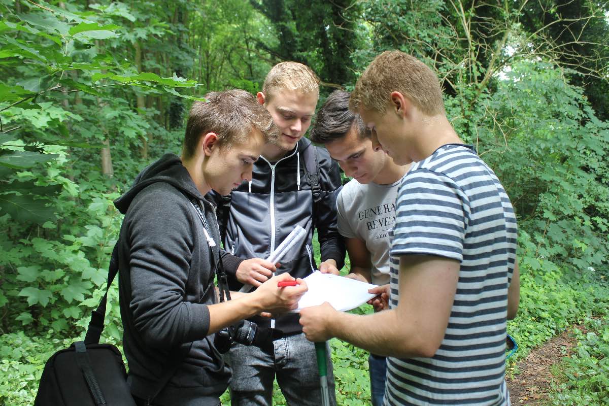 Gemeinsam war beiden Kursen, dass sie ein abiturrelevantes Thema, das Ökosystem Wald, nicht nur anhand von Texten, Diagrammen, Fotos und Filmen kennenlernen, sondern vor Ort selbst erkunden wollten. Während die Schülerinnen und Schüler der AH/12E sich hierfür die fachkundige Hilfe eines Forstbeamten sicherten, stand bei den angehenden Freizeitsportleitern die selbstständige Erforschung des großen Waldgebietes im Allgemeinen und einer kleineren Parzelle Wald im Speziellen im Mittelpunkt.