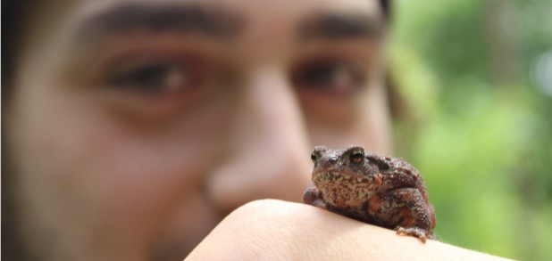 „Schau mir in die Augen, Kleines!“ So oder so ähnlich mögen die Schüler aus der AH/12F gedacht haben, als in ihrer Gesichtshöhe der warzig-daherkommende Bufo bufo, lässig-cool auf einer Hand sitzend, in die Runde schaut. Bufo bufo, das ist ein wissenschaftliche Name und ist zu deutsch die Erdkröte, ein Amphibium, das außerhalb der Laichzeit auch in heimischen Wäldern zu Hause ist. Aus dem Gebüsch kommend hoppelte Bufo bufo den angehenden Freizeitsportleitern auf ihrer Waldexkursion im Juni über den Weg. Sie waren an dem Tag nicht die einzigen, die sich zu einer Exkursion aufgemacht hatten: