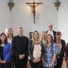 Bildunterschrift: Die Firmandinnen, hier mit ihren Paten und der Schulseelsorgerin Barbara Roghmanns (2.v. li.) und Pfarrer Arndt Thiele (4. v. re.), empfingen in unserer Hauskapelle von Weihbischof Theising (6. v. li.) das Sakrament der Firmung.
