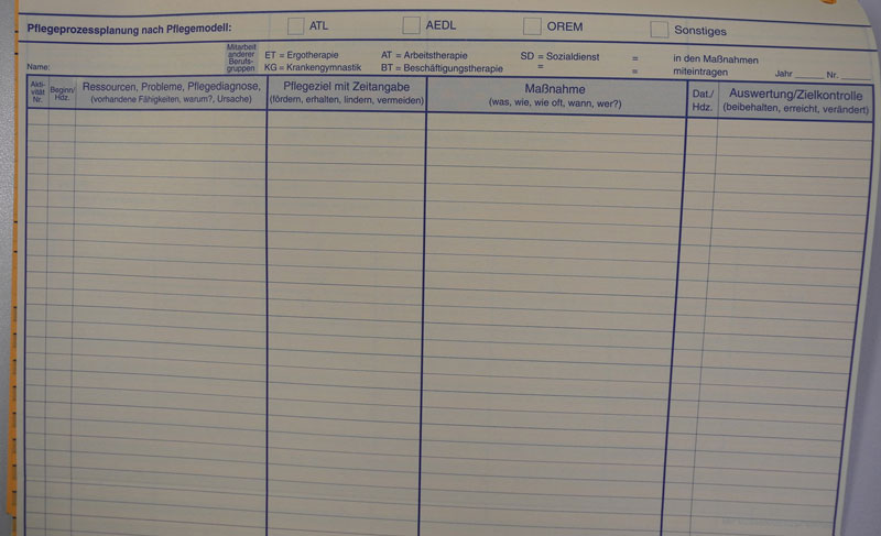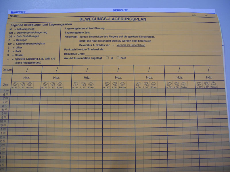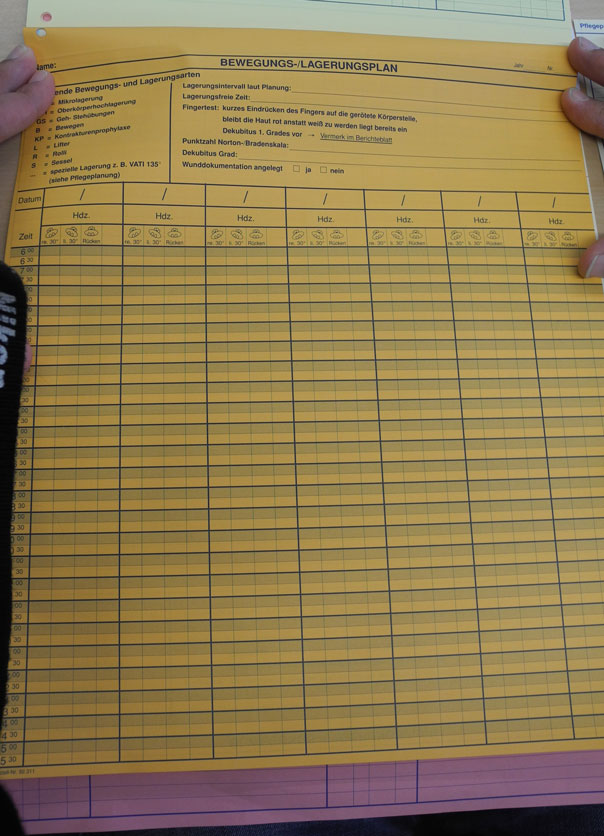 Wichtig bei der Dokumentation ist noch, dass alle Handlungen des Pflegepersonals unbedingt verständlich und nachvollziehbar dokumentiert werden. Was dabei alles so zu beachten ist, z. B. mit welcher Art von Stiften zu schreiben ist, welche Formulierungen verwendet werden dürfen usw., das hatten wir schon im Pflegeunterricht gelernt.