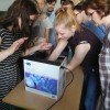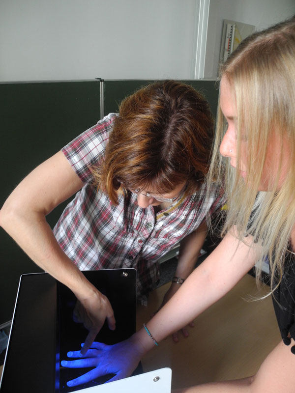 Und dann war es soweit. Jeder von uns wendete die Schritte an und ging anschließend zur UV-Lampe. Diese Lampe, die Frau Schüren mitgebracht hatte, diente zum Zwecke der Sichtbarmachung von perfekt desinfizierten Stellen, die unter der Lichtlampe blau leuchteten, sowie den nicht bzw. schlecht desinfizierten Stellen, die dunkel blieben. Der AHA-Effekt ließ bei uns nicht lange auf sich warten. Wir staunten nicht schlecht.