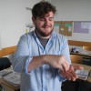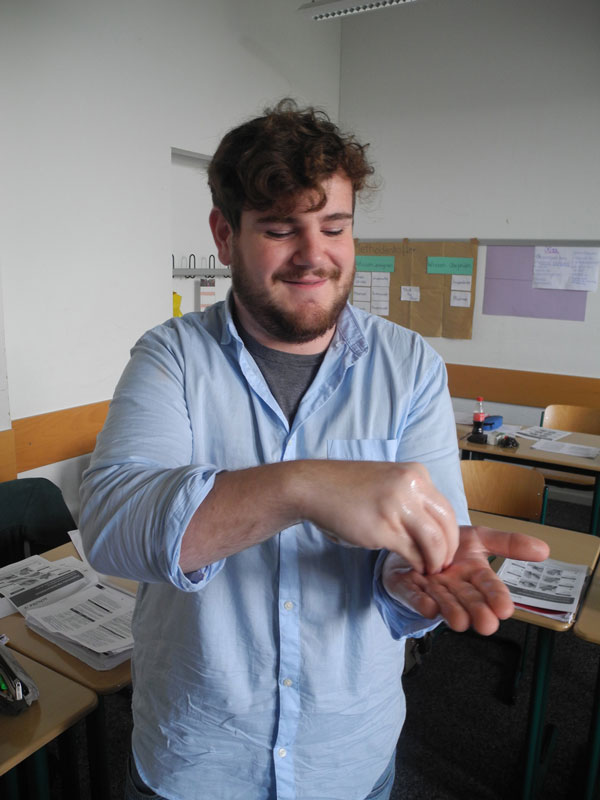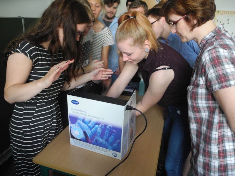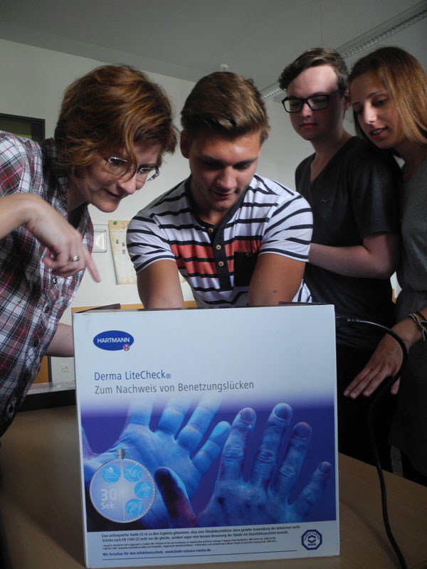 Interessiert verfolgten wir, wie sie den Inhalt nach und nach auspackte, bis schließlich eine große UV-Lampe zum Vorschein kam. Nachdem wir im Pflegeunterricht schon die Prinzipien der hygienischen Händedesinfektion erlernt und auch mal probeweise angewendet hatten, kam nun der ultimative „Check“, quasi der Feinschliff in der Praktikumsvorbereitung.