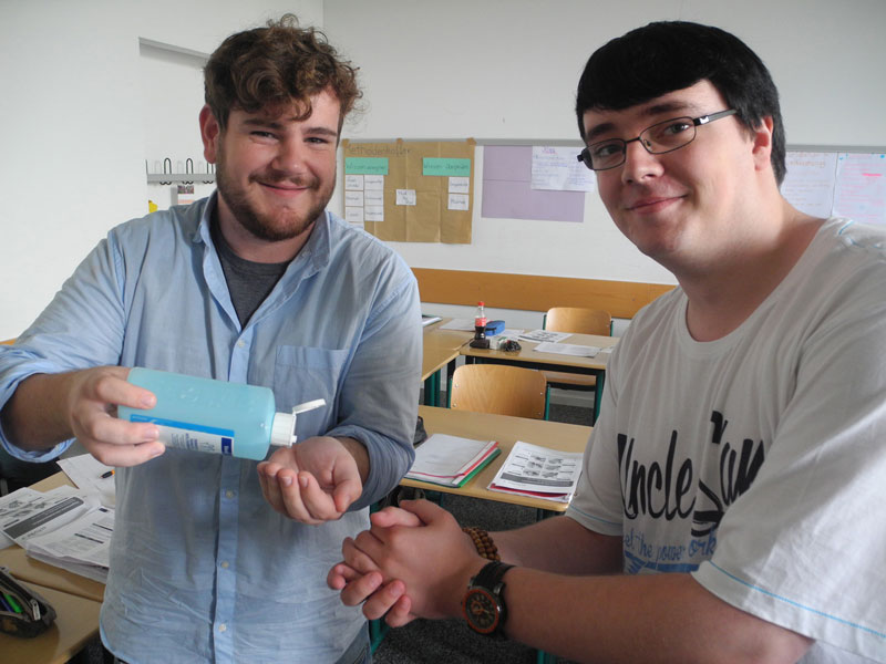 Auf den theoretischen Teil folgte dann der besonderes lehrreiche und auch beeindruckende praktische Teil: Frau Schüren wiederholte, wie das Desinfektionsmittel korrekt verwendet wird. Zur Erinnerung: Die Handdesinfektion ist in sechs Schritte aufgeteilt (siehe Abbildung), wobei jeder Schritt etwa 5 Sekunden durchgeführt werden sollte. Insgesamt muss das Desinfektionsmittel 30 Sekunden in die Haut einwirken, um das erwünschte Ziel zu erreichen. Die Menge des Desinfektionsmittels, die benötigt wird, ist individuell und abhängig von der Größe der Hand. Wichtig ist hierbei, das die Kuhle der Handinnenfläche gefüllt ist.