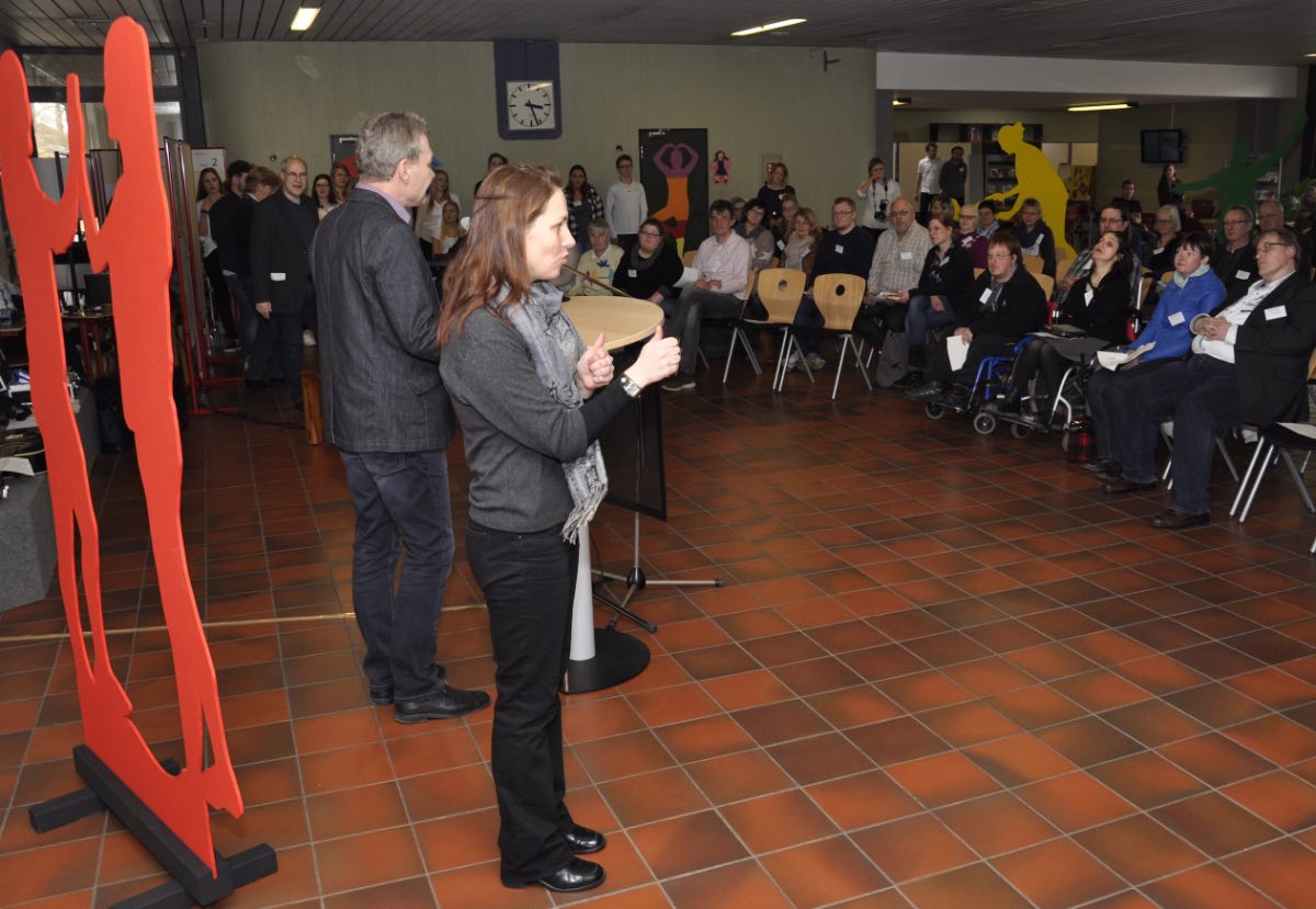 Für den gastfreundlichen Empfang der Forumsteilnehmer sorgten Studierende der Fachschule für Heilerziehungspflege, die am Berufskolleg angesiedelt ist. Die Lehrer Franziska Kirchhoff und Andreas Mäteling hatten, zusammen mit einigen Studierenden, bereits an früheren Foren in Münster und Warendorf teilgenommen. „Sie waren begeistert und wollten solch ein Forum in Geldern anbieten“, berichtete Mäteling. Sogar eine Ausstellung mit Bildern und Skulpturen hatten sie vorbereitet, um Denkanstöße zu geben. Außerdem hatten sie die Möglichkeit, aktiv an den Gesprächen im Forum teilzunehmen: „So können sie vor Ort sehen, welche Bedürfnisse es gibt und praktische Erfahrungen machen, wenn sie mit den unterschiedlichen Menschen in Kontakt kommen. Wir finden es super, dass das Inklusions-Forum hier nach Geldern gekommen ist“, sagte Mäteling.