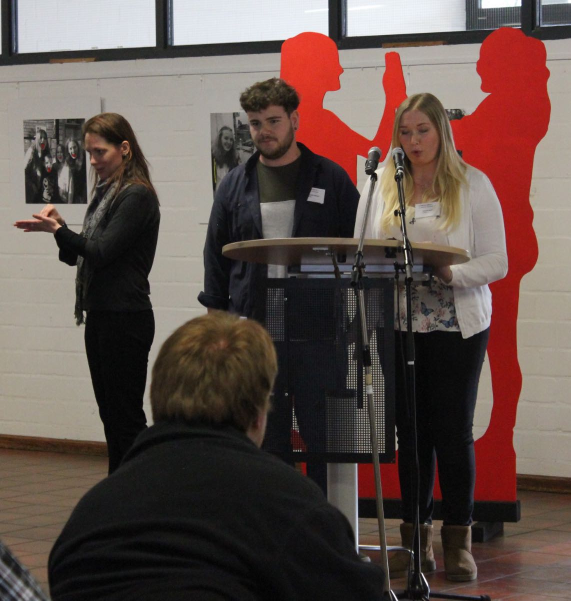 Judith Zeus muss sich besonders konzentrieren, als Bernd van Essen an das Mikrofon in der Pausenhalle tritt. Während der Schulleiter der Gelderner Liebfrauenschule, Berufskolleg des Bistums Münster, die Zuhörer begrüßt, übersetzt Judith Zeus seine Rede simultan in Gebärdensprache. Eine anstrengende Tätigkeit, daher wechselt sie sich regelmäßig mit einer Kollegin ab.