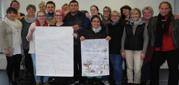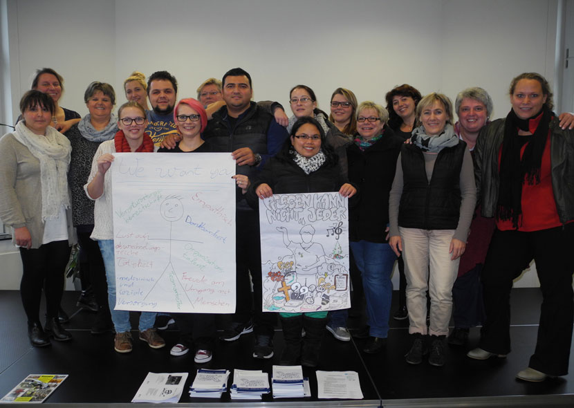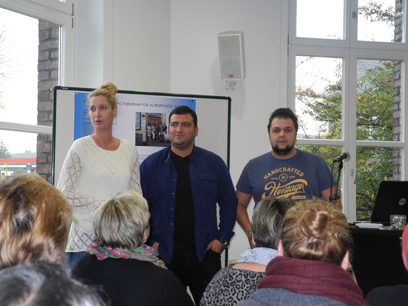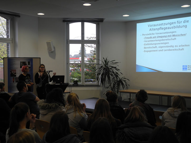 Als zweites kam eine komplette Klasse des Evangelischen Fachseminars für Altenpflege aus Xanten mit ihrer Klassenlehrerin Frau Kaymer zu uns. Mit medialer Unterstützung durch eine PowerPoint-Präsentation und mit Hilfe von anschaulichen Plakaten und Flyern nahmen sie uns mit auf die „Reise“ durch die dreijährige Ausbildung zur staatlich geprüften Altenpflegerin und stellten uns ihre sehr unterschiedlichen Einsatzfelder vor, zu denen neben dem klassischen Seniorenheim u. a. gerontopsychiatrische Einrichtungen und ambulante Dienste gehören. Die Vielfalt an Einrichtungen, in denen man als Altenpfleger/in tätig sein kann, war uns vorher noch gar nicht so bewusst und weckte unser Interesse. Neben dem Inhaltlichen fanden wir vor allem spannend, dass sie alle in einer unterschiedlichen Altersklasse waren, von zwanzig bis fünfzig Jahren war alles dabei. Alle berichteten im Rahmen kleiner Präsentationen sehr offen von ihren Erfahrungen mit den Senior/innen und den Pflegeteams in ihrer jeweiligen Ausbildungsstelle und beantworteten geduldig unsere zahlreichen Fragen. Ein besonderes Interesse galt dabei den Besonderheiten in der Pflege demenziell veränderter Bewohner/innen und den damit verbundenen Anforderungen an die Pflegenden.