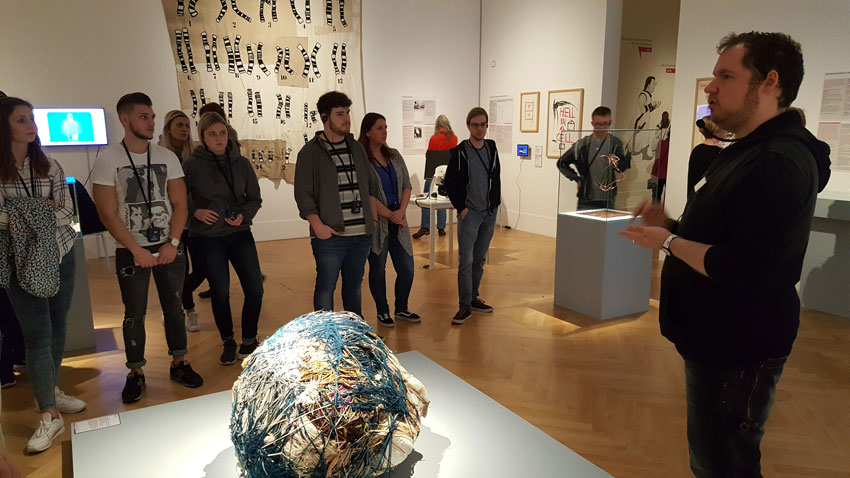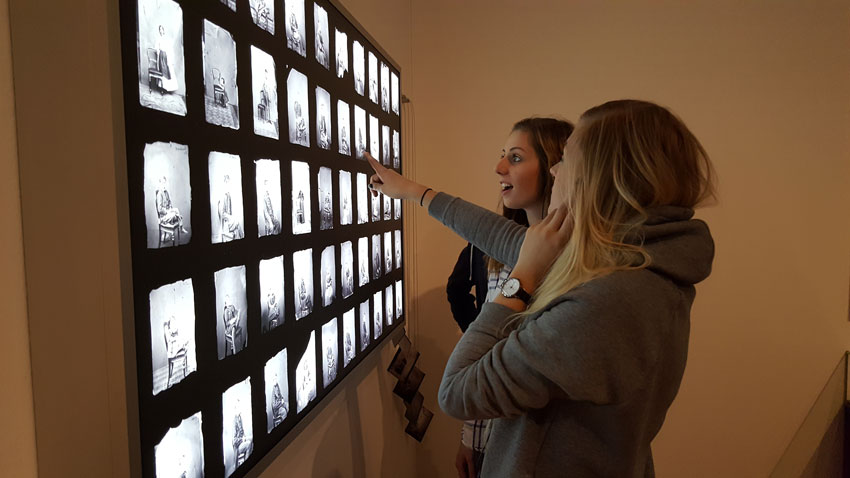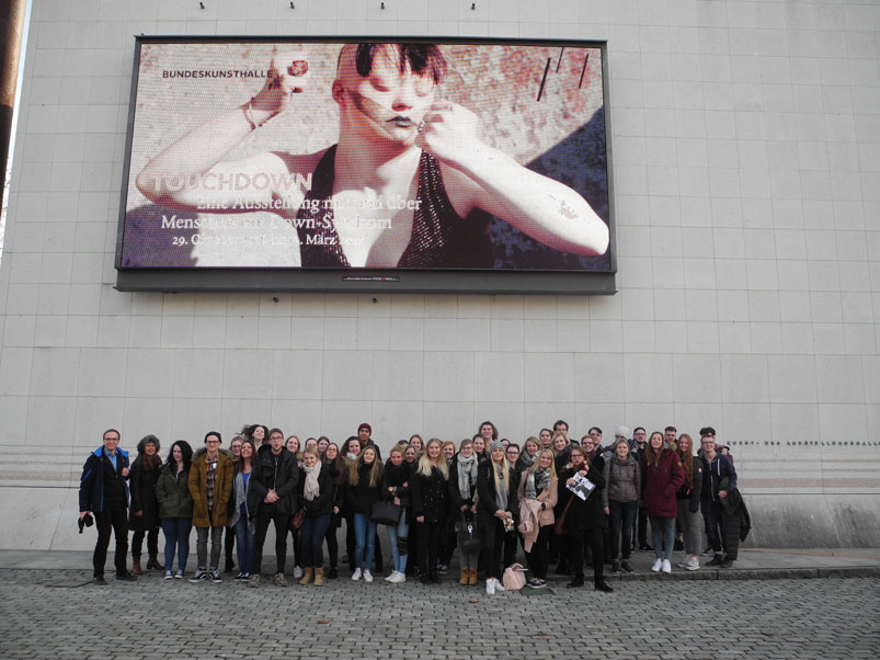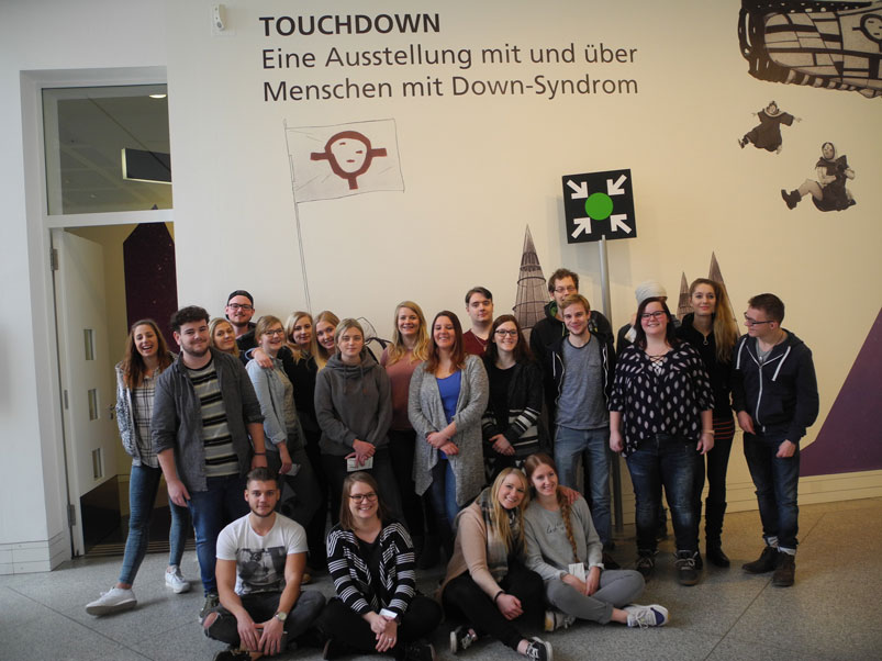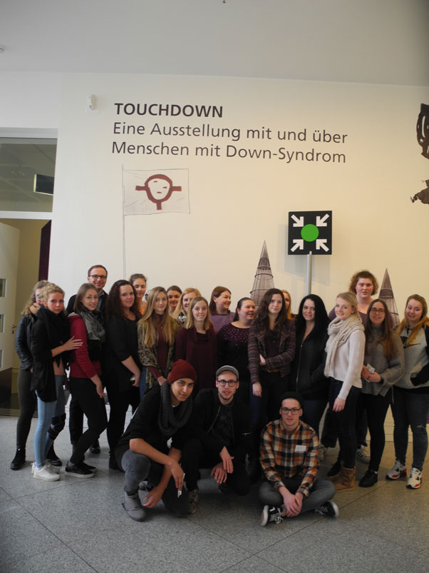 Am 09. Februar 2017 machten wir, die HEP/U, gemeinsam mit der Klasse HEP/O und in Begleitung unserer Lehrer/innen Frau Kirchhoff, Frau Hanrath und Herr Mäteling eine Exkursion nach Bonn in die dortige Bundeskunsthalle, in der zurzeit die Ausstellung „TOUCHDOWN“ zu sehen ist. Durch die Ausstellung begleitet wurden wir von der Kunstvermittlerin Frau Baetz, die uns auf eine „Reise“ durch die Geschichte mit und über Menschen mit Down-Syndrom mitnahm. Zu Beginn erklärte sie uns die Bedeutung des Titels der Ausstellung, welcher zwei Bedeutungen hat. Zum einen wird hiermit die erfolgreiche Landung im Weltall in Verbindung gebracht, zum anderen ist es ein Begriff für einen Punkt beim Football, wenn der Ball hinter der Linie abgelegt wird.