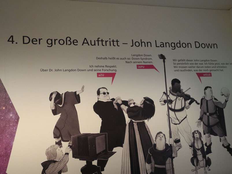 Um John Langdon Down ging es bei der vierten Station „ Der große Auftritt – John Langdon Down“.Er war Fotograf, Arzt und medizinischer Leiter eines Wohnheimes für Menschen mit Behinderungen und der erste, der respektvoll im Umgang mit ihnen war. Bei seinen Forschungen fiel ihm auf, dass viele der Bewohner ein ähnliches Erscheinungsbild aufwiesen. Er begann zu forschen und beschrieb dieses Erscheinungsbild als erster Forscher überhaupt. Im Jahre 1960 entstand schließlich der Begriff des nach ihm benannten„Down-Syndroms“.