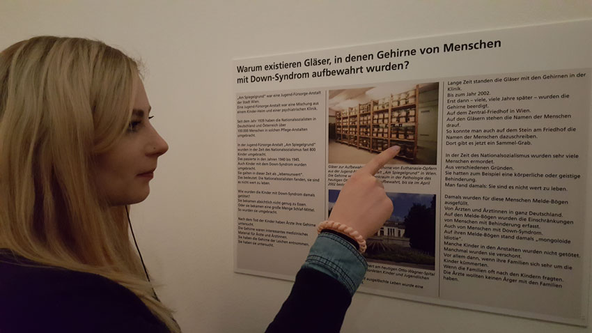 Anschließend folgte ein separater Raum, in dem es um die Lebensumstände von Menschen mit Behinderungen während der NS-Zeit ging. „Im Halb-dunkel – Die Auslöschung“ war der Titel und man konnte ihn „links liegen“ lassen, falls man sich damit nicht auseinandersetzen möchte, was laut Frau Baetz häufiger der Fall ist, wenn Menschen mit Down-Syndrom selber die Ausstellung besuchen. Diese Menschen galten damals als „lebensunwert“ und ihnen wurde der, wie man damals – und für uns unerträglich makaber – sagte „schöne Tod“ beschert (Stichwort: Euthanasie). Insgesamt hatte dieser Raum eine sehr bedrückende Stimmung. Wir standen zum Teil fassungslos vor den Briefen, die an Eltern geschickt wurden, deren von Down-Syndrom betroffene Kinder ermordet wurden, denen man aber schrieb, ihre Kinder seien an einer Infektion verstorben. Es schauderte uns vor so viel Menschenverachtung.