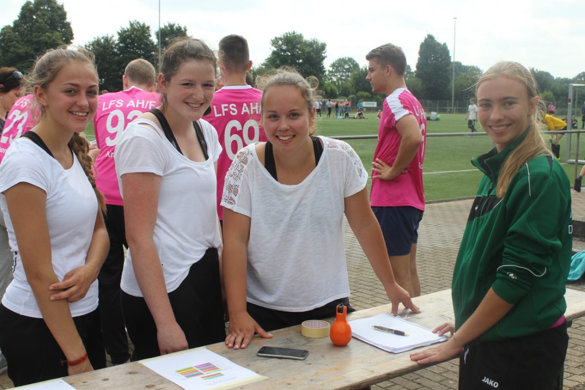 Der Stand der Turnierleitung, die souverän von Schülerin Alina Jansen gemanagt wurde, war zwischendurch immer dicht umringt, liefen dort doch die Ergebnisse der Spiele ein. Da zwei Mannschaften nicht gekommen waren, musste kurzfristig der gesamte Turnierplan neu gestrickt werden. Doch für Alina Jansen kein Problem: „Während fünf Schülerinnenteams alle auf dem Kleinfeld gegeneinander antraten, spielten die Jungenteams in zwei Vorrunden um den Einzug ins Halbfinale.“ Derweil verwöhnten die angehenden Freizeitsportleiter Spieler wie Zuschauer mit fruchtigem Obst, leckerem Kuchen, knusprigen Chicken Wings und kühlen Getränken.