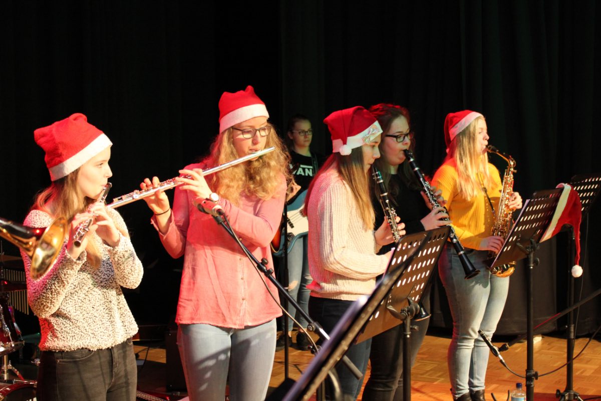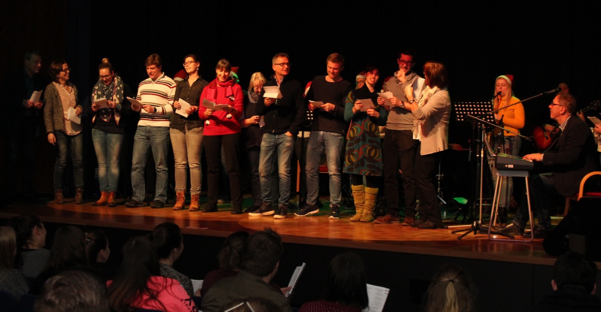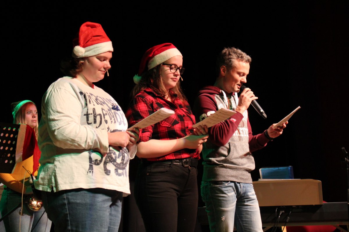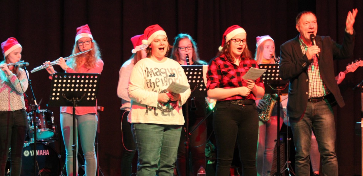 Alle Jahre wieder ….. – ja, so heißt nicht nur ein bekanntes Weihnachtslied. Alle Jahre wieder lädt unser Musiklehrer Herr Baumgärtner mit einer Gruppe engagierter Sängerinnen und Musiker am letzten Tag vor den Weihnachtsferien zum Offenen Singen in die Aula ein. Das ist stets eine wunderschöne Einstimmung auf das Weihnachtsfest! Auch die Lehrer mussten dabei wie jedes Jahr in unterschiedlichen Sprachen Weihnachtslieder vortragen. Das schien den Schülern auch dieses Mal wieder zu gefallen. Mit einem Lied gedankt wurde in diesem Rahmen auch Herrn van Essen für seine 25-jährige Tätigkeit als engagierter Schulleiter, der für alle Belange stets ein offenes Ohr hat.