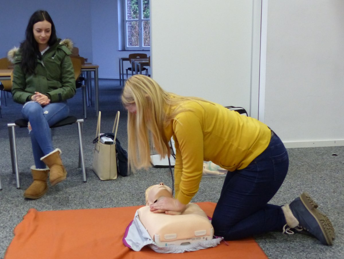 Die angehenden Sozialassistentinnen und -assistenten aus der Unterstufe, die am 18. und am 22. Januar 2018 in kleinen Gruppen von 9 bis 10 Personen an einem Erste-Hilfe-Kurs der Malteser mit neun Unterrichtsstunden teilnahmen, sind nun für den Ernstfall geschult. Der Kurs fand in Kooperation mit dem Gesundheitszentrum des St. Bernard-Hospitals in Kamp-Lintfort statt.