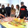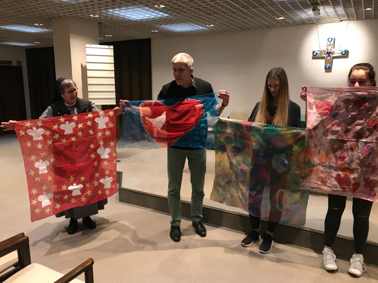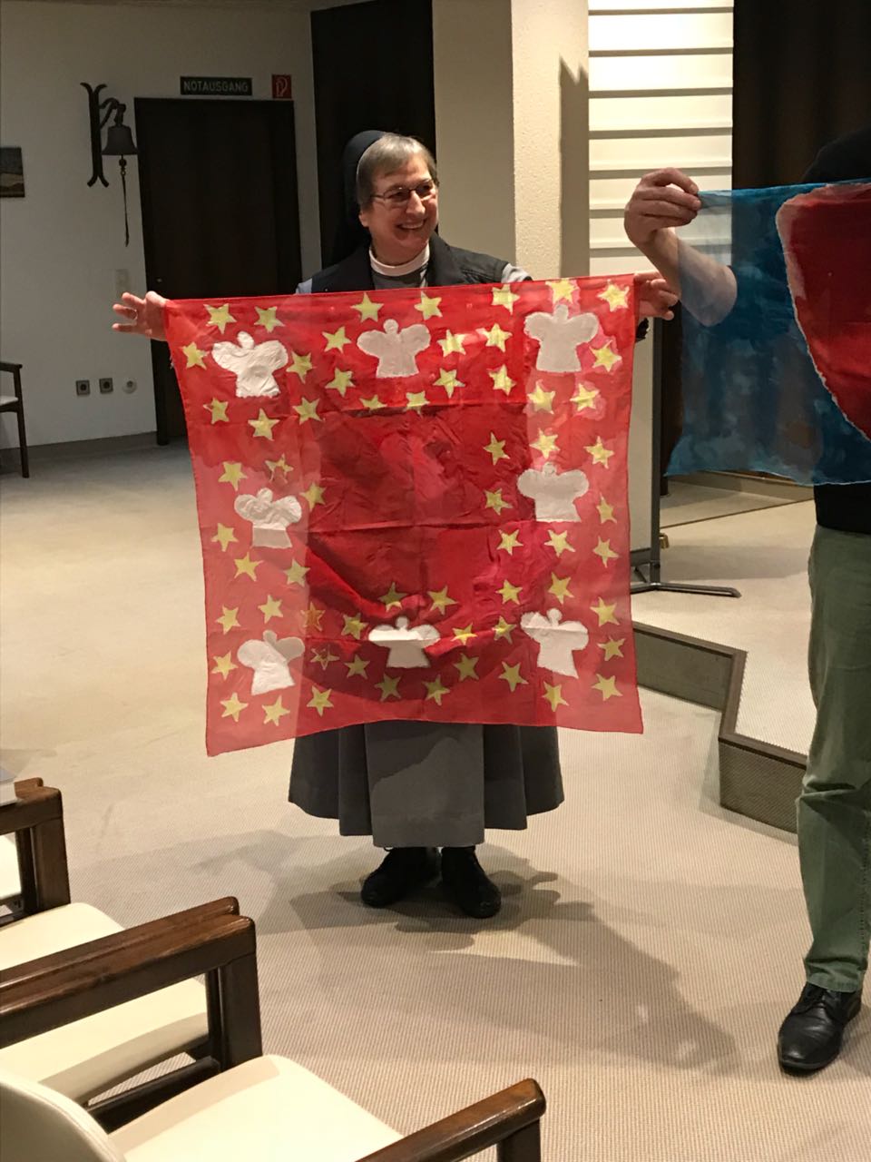Bild oben: Schwester Marlies Mauer und Martin Naton (v.r.) nahmen die von den Schülerinnen und Schülern gestalteten Seidentücher in der Krankenhauskapelle entgegen.