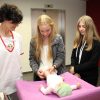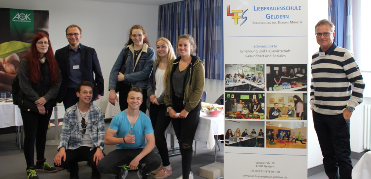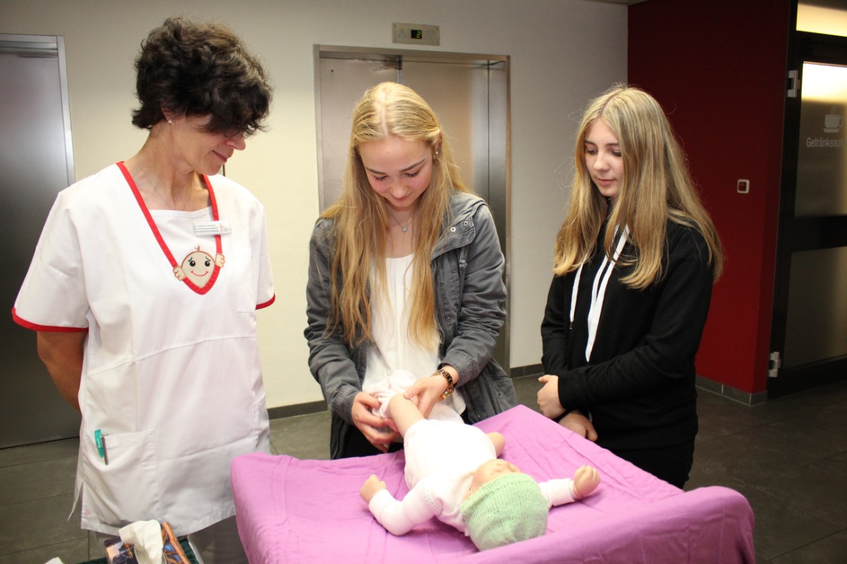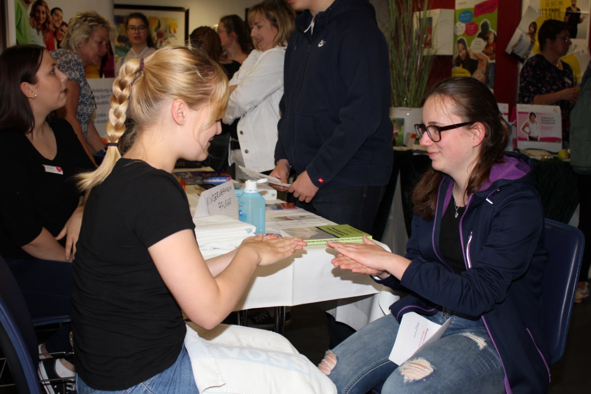 Es sieht so simpel aus, genauso wie Händewaschen. Doch im Detail steckt das Besondere. Zum Schutz der Patienten, aber in gleichem Maße wie für einen selbst, besitzt das Desinfizieren der Hände im Umgang mit Patienten eine hohe Priorität. Wie das exakt geht, weiß nun Lena-Sophie aus der FH/11G ganz genau. Im Rahmen des Tages der Ausbildung über Gesundheitsberufe hatte sie sich mit zahlreichen Mitschülerinnen und Mitschülern auf den Weg ins Gelderner Clemenshospital gemacht, um einen kleinen praxisnahen Einblick in verschiedene Berufe wie beispielsweise den der Hebamme, des Physiotherapeuten, der Hygienefachkraft oder des Gesundheits- und Krankenpflegers zu erlangen. Infos gab es aber zum Beispiel auch über die Ausbildung und die konkreten Tätigkeiten eines operationstechnischen Assistenten oder über die unterschiedlichen Tätigkeiten im Bereich der Krankenhausverwaltung oder der Krankenkassen. Ebenso wie die Berufsberatung der Agentur für Arbeit und andere Einrichtungen war auch die Liebfrauenschule vor Ort, um Schülerinnen und Schüler anderer Schulen über ihre Bildungsgänge zu informieren und zu erläutern, inwiefern diese passgenau Kompetenzen vermitteln, die in einzelnen Berufen gefordert werden.