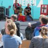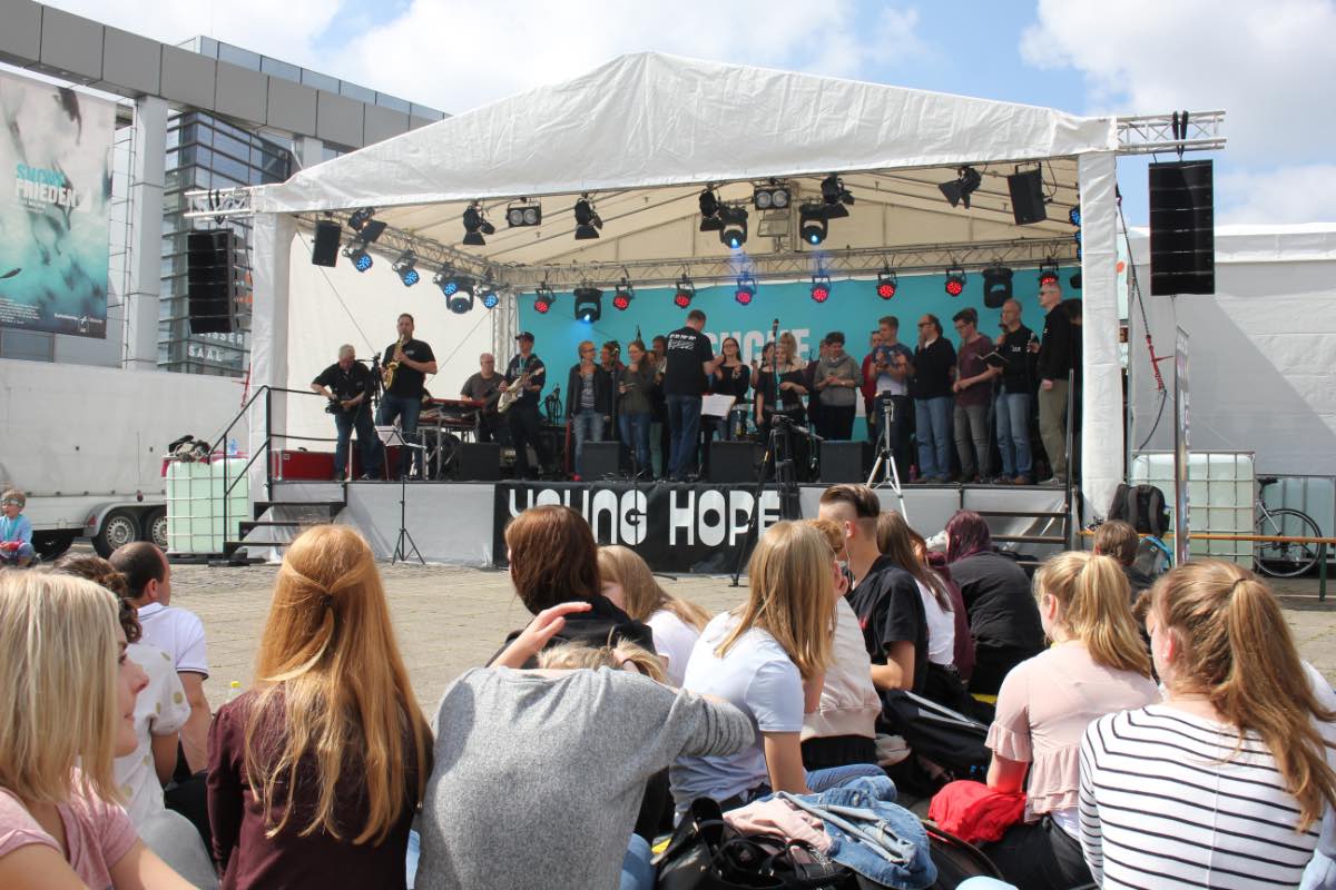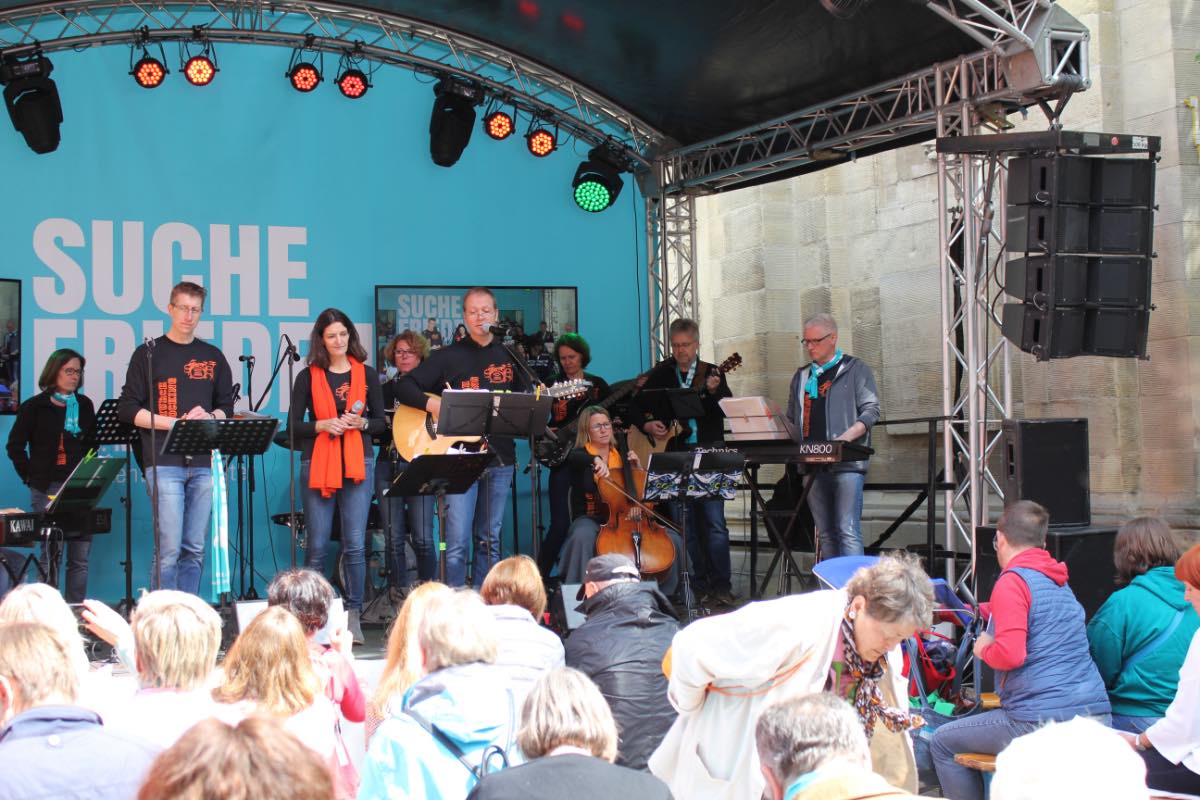 Aber auch darüberhinaus bot das Schlendern durch die festlich mit Fahnen geschmückte Innenstadt eine beachtliche Palette an Kurzweil und Unterhaltung. Kaum zählbar war die Anzahl großer und kleiner Bühnen, von denen mal rockig-flotter Sacropop und mal heiter-beschwingter Sound mit religiös-kirchlicher Thematik erklang. Beeindruckend war auch das Angebot auf der Kirchenmeile vor dem Schloss, auf der sich unter Pavillons Info- und zum Teil Mitmachstände aneinanderreihten, die von den Bistümern, kirchlichen Vereinen, Verbänden und Institutionen, aber auch von kleineren anderen Gruppierungen wie z. B. von katholisch-orientierten Schwulen und Lesben gestaltet waren.