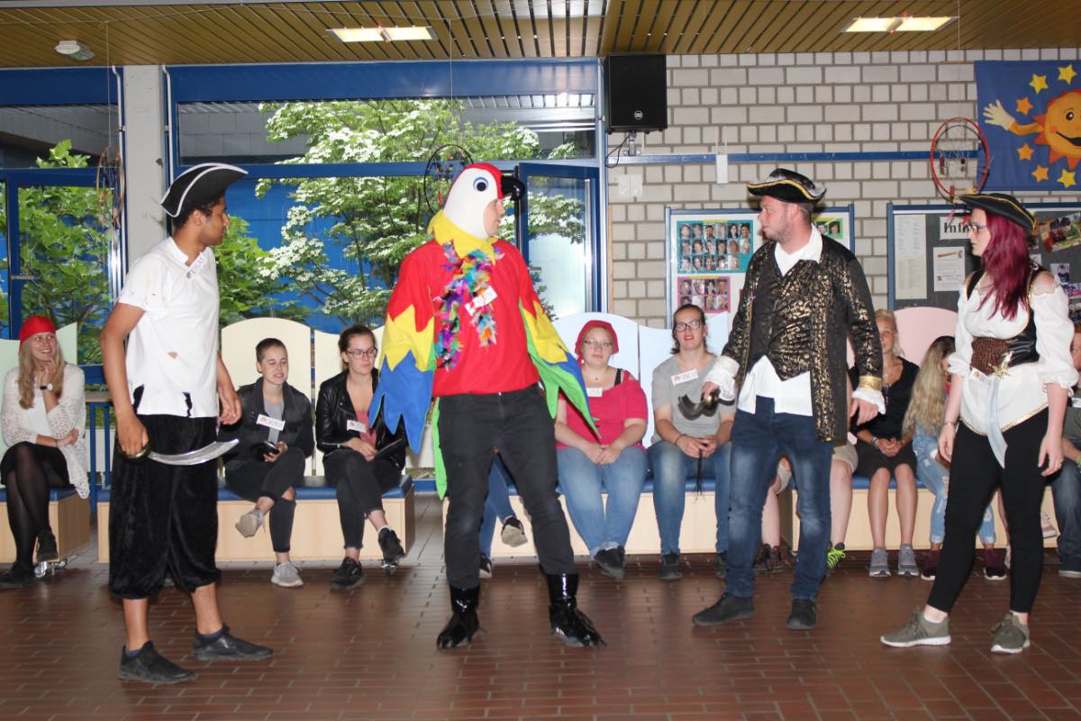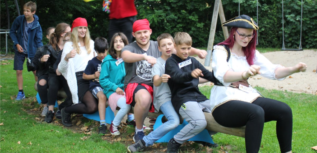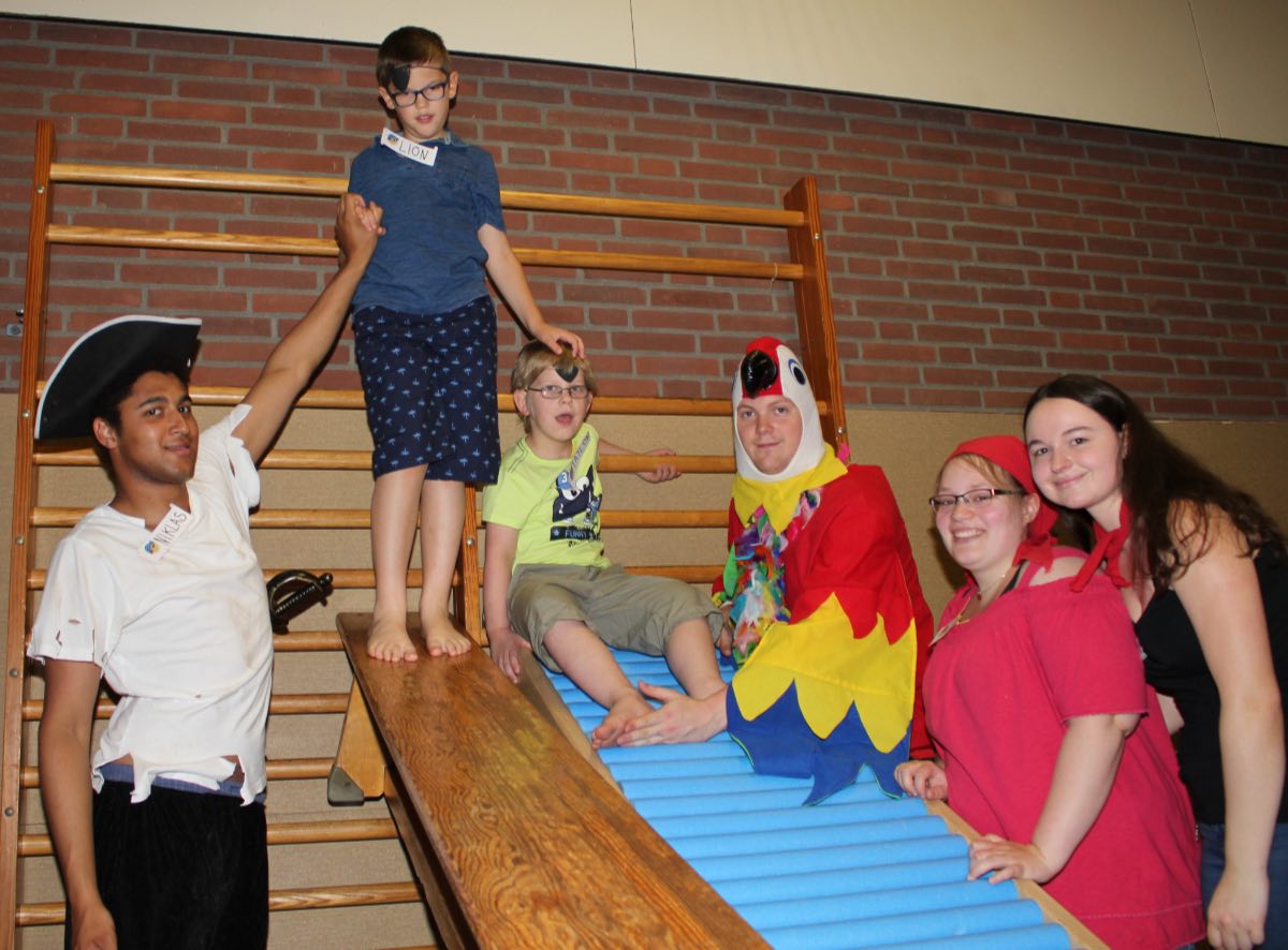„Wir hatten uns recht schnell gegen Ritter und für Piraten als Motto für den Tag entschieden“, erzählt Niklas Hümbs, einer der Studierenden. „Das Thema interessiert die Kinder, eine fantasievolle Geschichte, spannende Spiele und passende Übungen lassen sich dazu ohne große Probleme erfinden und zum Abschluss können wir sogar noch den Piratentanz machen!“