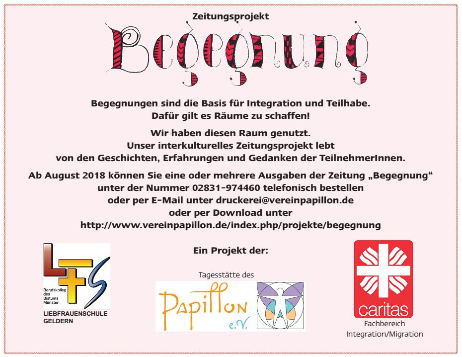 Heimlich, still und leise hat in Kooperation mit unserer Schule ein kleines Projekt stattgefunden, das nun aber bald seinen großen Auftritt haben wird: das Zeitungsprojekt „Begegnung“, initiiert von der Caritas, Papillion e.V. und der LFS, Berufskolleg.