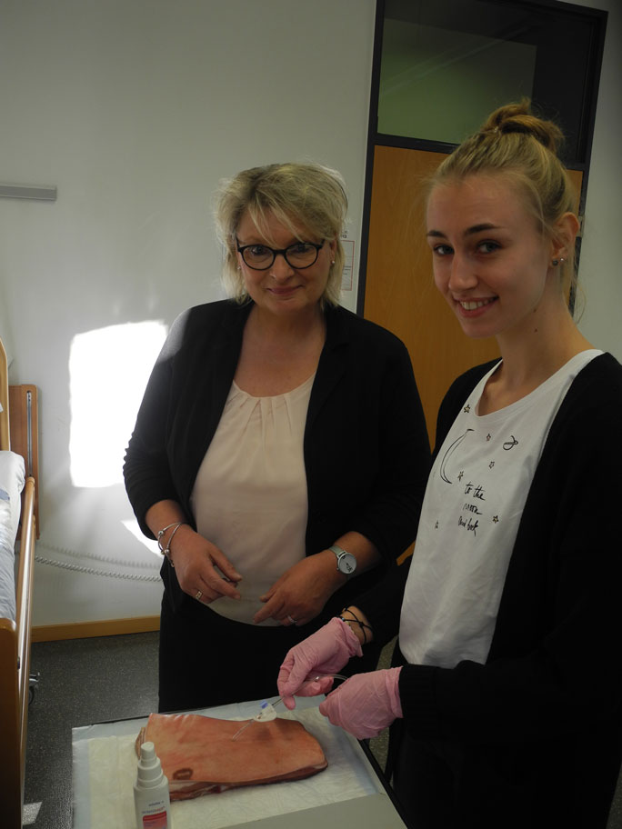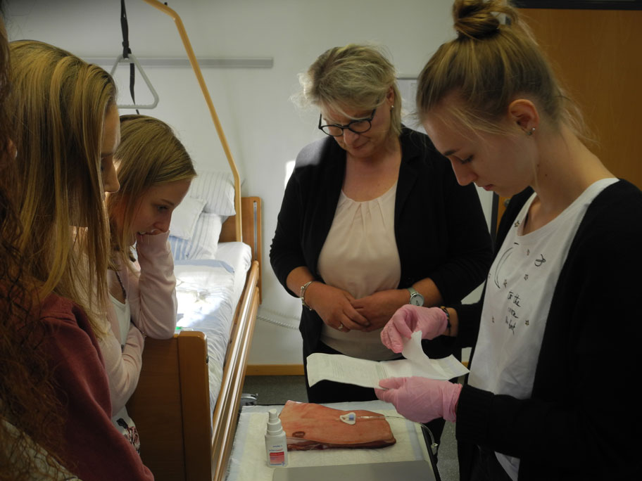 Wie man eine PEG-Sonde (percutane endoskopische Gastrostomie) versorgt, hatten wir bereits im Fach Pflege/Gesundheit erfahren und auch praktisch geübt. Im Rahmen eines Workshops aber bestand für uns Berufspraktikant/innen nun die Gelegenheit, dies mit der Expertin Frau Traunsberger, einer Anwendungsberaterin für Medizinprodukte, zu vertiefen.