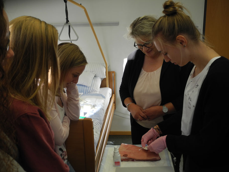 All das Gesagte und zum Teil Geübte bekamen wir am Ende noch in Form einer anschaulichen Checkliste zum Verbandswechsel, Spülen der Sonde, Anschluss der Nahrung etc. an die Hand, was uns sehr nützlich für die berufliche Zukunft erschien. Dafür dankten wir abschließend ebenso wie für den sehr praxisnahen Workshop bei dem wir im wahrsten Sinne des Wortes „hautnah“ mit der PEG-Sondenpflege in Kontakt kamen.