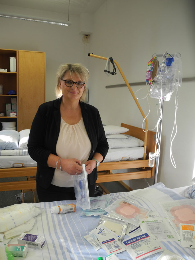 Unter Nutzung einer Checkliste führte uns Frau Traunsberger zuerst noch einmal die korrekte Pflege einer PEG-Sonde vor. Schließlich hieß es dann auch für uns: „Ran an den Speck!“ Jede und jeder durfte mit Schlitzkompressen, Fixomull, Magensondenschlauch etc. aktiv werden. Nach erfolgreich erfolgter Sondenpflege galt unsere Aufmerksamkeit dann auch noch den Ernährungspumpen. Zu deren Nutzung aber bedarf es in der Praxis laut Medizinproduktegesetz noch einer speziellen Schulung.