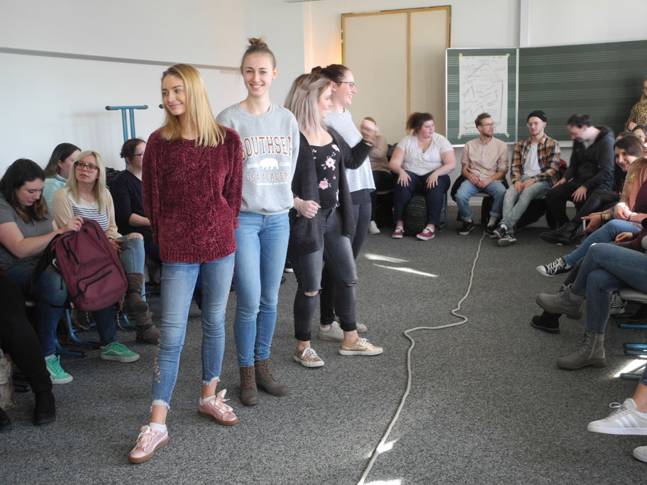 Herr Flechtner startete seinen informativen Besuch mit einer „Warm-up“-Runde, indem er verschiedene Statements vorlas und die Studierenden zu den Statements aufstehen sollten, die sie als passend empfanden. Mit Fragen und Aussagen wie: „Wer war schon in der Förderschule tätig?“ oder „Ich habe schon mit Menschen mit einer Autismus-Spektrum-Störung gearbeitet“ schaffte er eine lockere Atmosphäre in den Stuhlkreis. In den Statements ging es um verschiedene Verhaltensweisen, die wir kennen gelernt haben, in welchen Einrichtungen wir schon Praktika gemacht haben oder welchen Umgang bzw. auch welche Präventionsmaßnahmen wir mit den Menschen erleben durften. Dabei konnten die Teilnehmenden Beispiele aus ihrer Praxis erzählen.