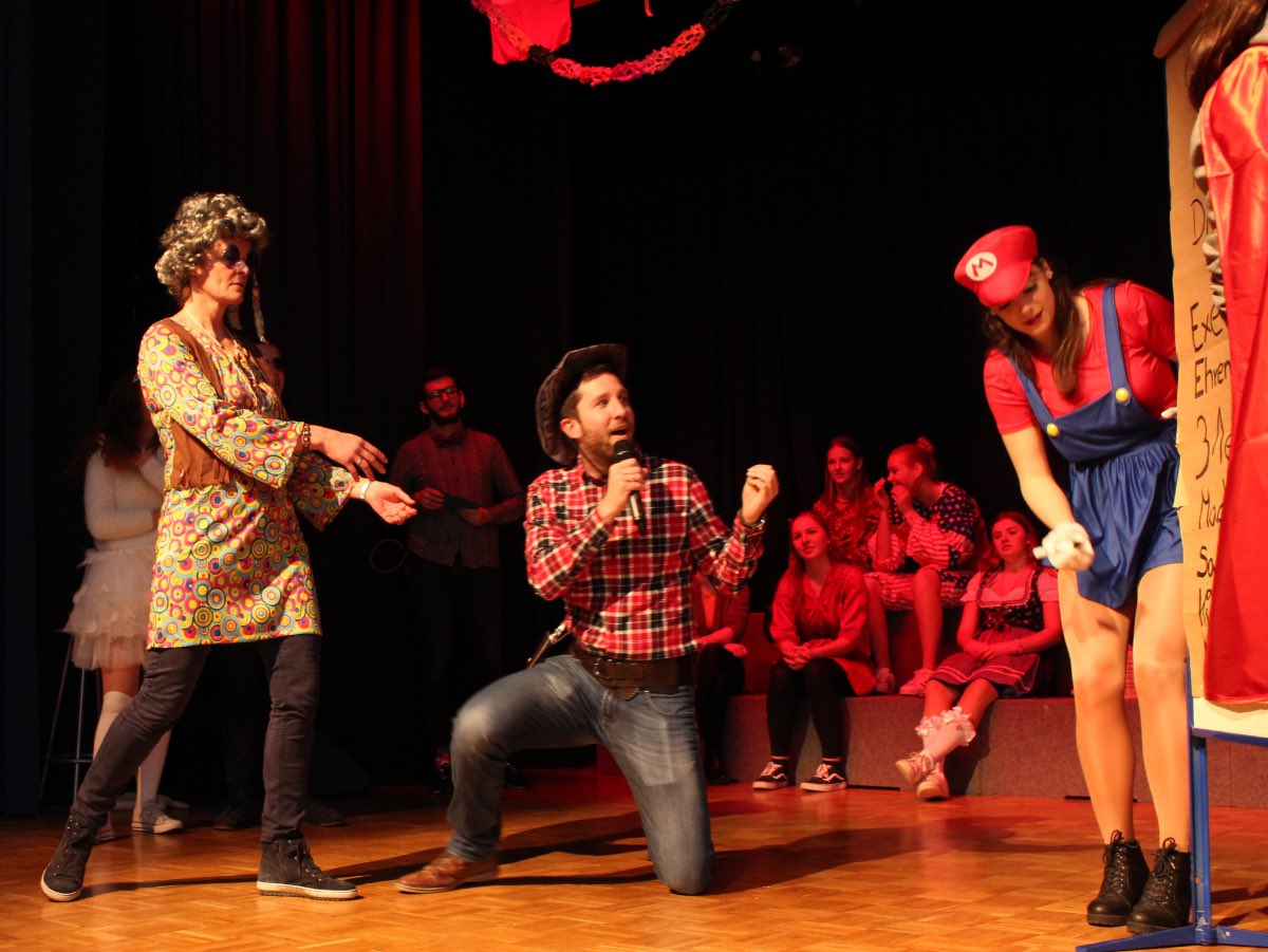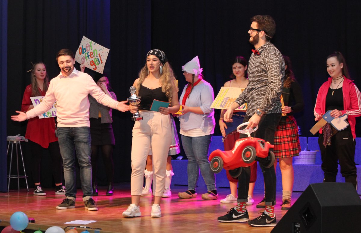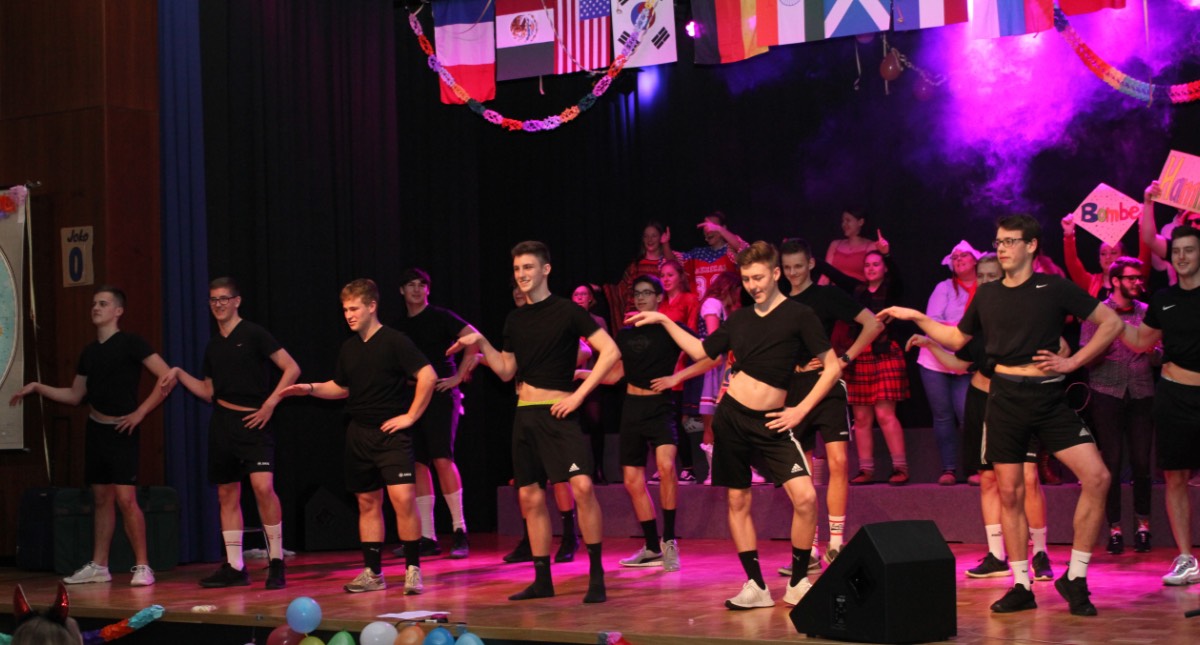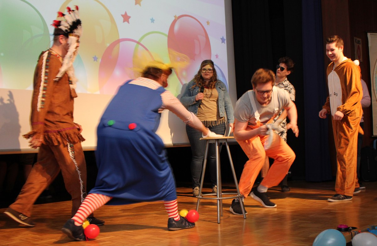 Die SV machte es möglich: An Altweiber waren Joko und Klaes in unserer Aula, um das Duell um die Welt zu spielen…..Joko, unterstützt durch ein Lehrerteam, und Klaes, der auf die Schülerinnen und Schüler bauen konnte. In Usbekistan, in der Türkei, in Russland, in Frankreich, in den Niederlanden und sonst wo in der weiten Welt hatten sich die beiden Entertainer Anregungen für ihre Aufgaben besorgt und gleichfalls unterhaltsame Programmpunkte, sei es Tanz, sei es Gesang organisiert. In den Challenges mussten Karnevalssongs erraten, angebliche Delikatessen verkostet und Heiratsanträge geschmiedet werden – kein leichtes Unterfangen für die beiden Teams. Insgesamt gingen die Wettbewerbe unentschieden aus. In der ersten Altweiberfeier siegte „Team Joko“, im zweiten Durchgang „Team Klaes“.