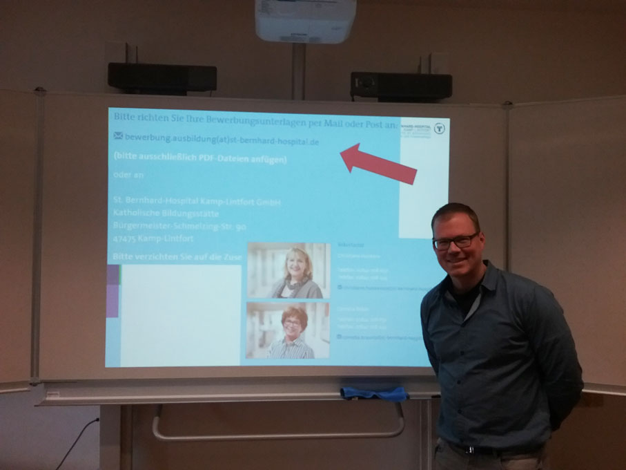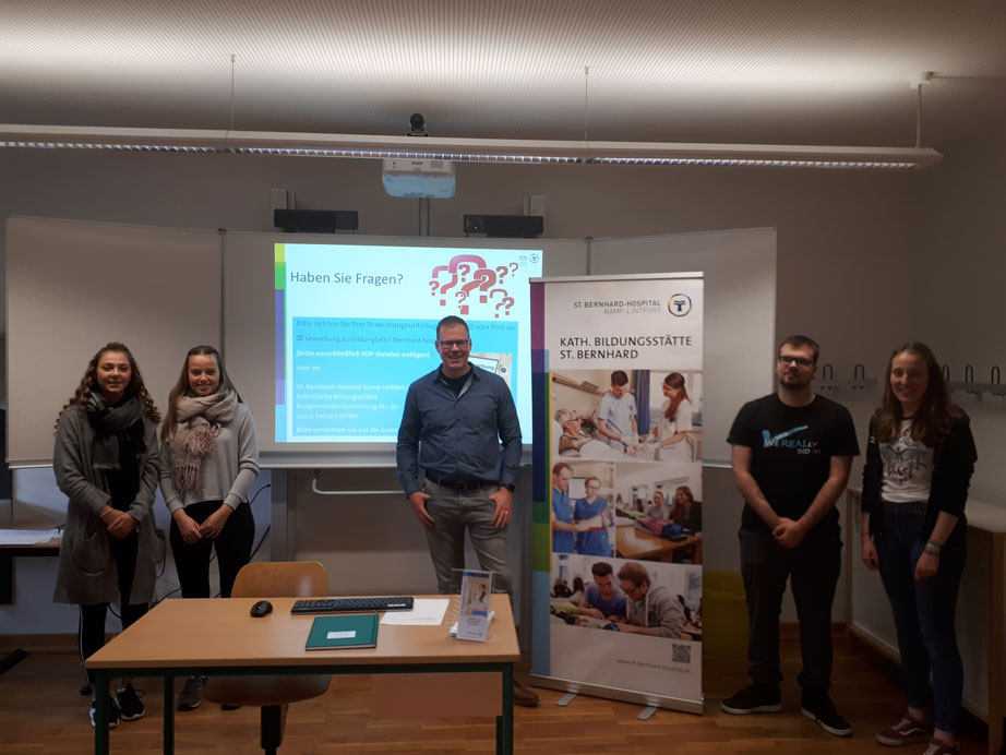 Am 19.02.2019 bekamen wir, die FH11 G1, ebenso wie zuvor schon die FH11 G2 und G3, Besuch aus Kamp-Lintfort. André Geurtz, der Schulleiter der Katholischen Bildungsstätte St. Bernhard, brachte uns mit Hilfe einer PowerPointPräsentation die Ausbildung und vor allem den Beruf des/der Gesundheits- und Krankenpflegers/-in näher und half uns damit bei der Beantwortung der Frage, ob eine Ausbildung in dem Bereich was wäre.