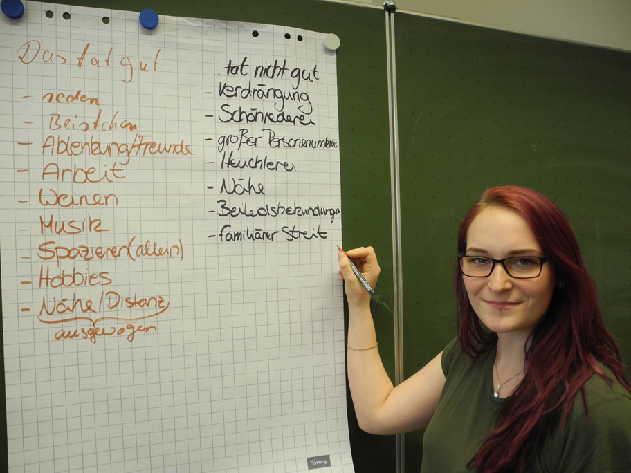 Dass gerade auch die Bewältigung von kleineren Krisen wichtig ist, verdeutlichte Herr Ueberfeld damit, dass wir an kleinen Krisen wachsen und hier die Grundlage dafür erlernen, wie wir später mit größeren umgehen. In intensiven Gesprächen innerhalb der Gruppe, die hier aus Gründen der Diskretion nicht wiedergegeben werden, haben wir dann mit Herrn Ueberfeld darüber gesprochen, was uns persönlich bei der Bewältigung geholfen hat.