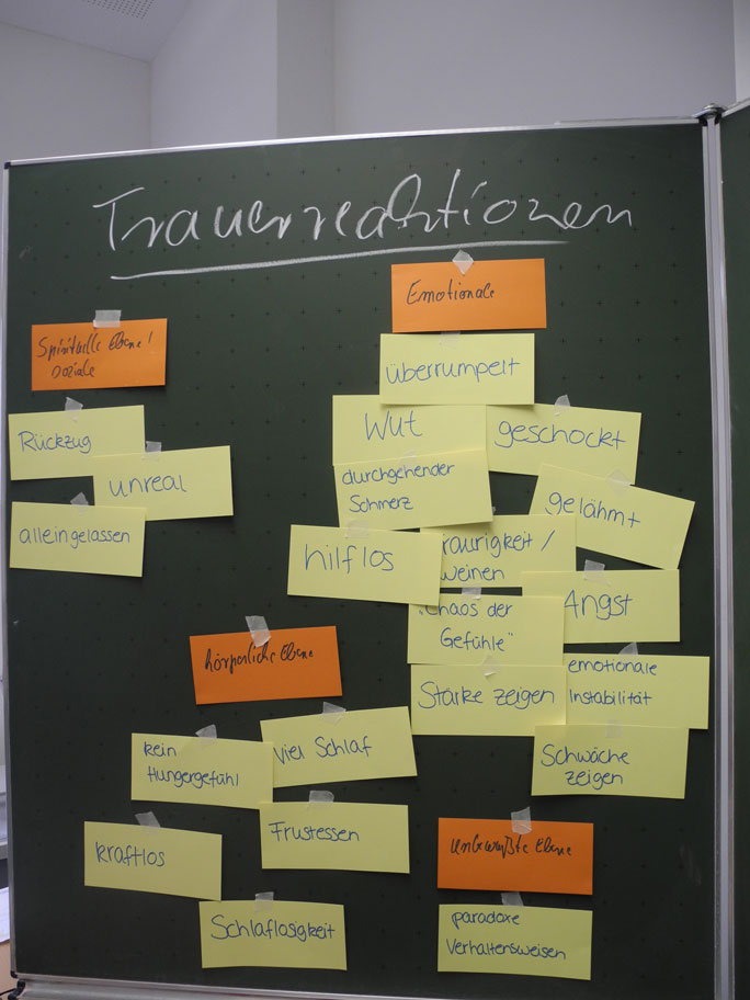 Nach einer kurzen Einführung war sofort klar, dass Tod und Trauer ein entscheidendes Thema im Leben eines jeden Einzelnen ist und die so genannte Trauerarbeit keineswegs mit einem schnell gesagten „Mein Beileid“ beendet ist. Er machte dann auch rasch deutlich, dass sich Trauerarbeit nicht nur auf das Thema Tod beschränkt, sondern auf jegliche Verarbeitung von Verlusten, die häufig eine Trauerreaktion auslösen. Um zu verdeutlichen, dass diese für jeden allgegenwärtig sind, sollten wir in Einzelarbeit aufschreiben, welche Verluste wir im Leben schon erlebt hatten.