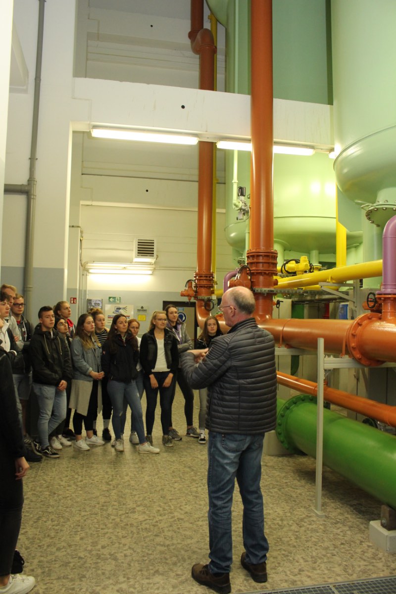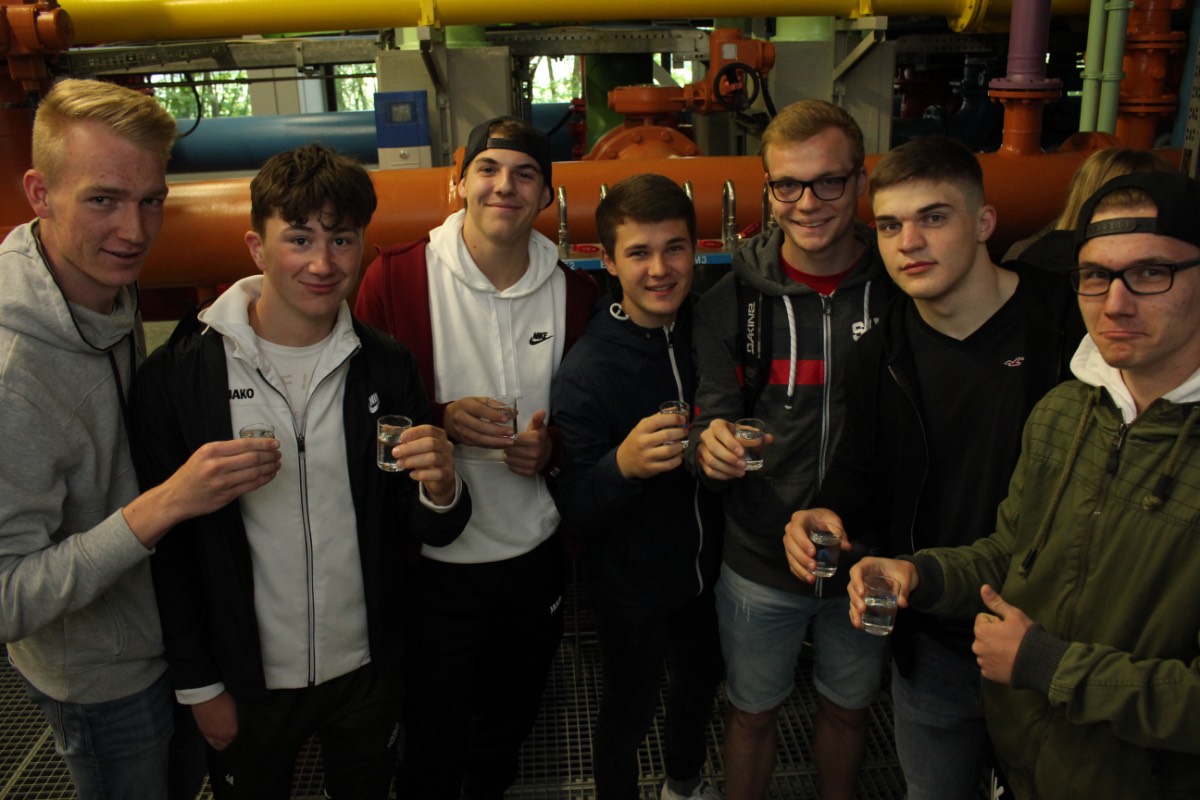 Das geförderte Wasser ist zwar trinkbar, aber ein Genuss ist es nicht. „Es ist eisen- und manganhaltig und besitzt zu viel Kohlensäure“, klärte der Wasserexperte auf. Die Kohlensäure, die man als Konsument zwar schätzt, muss entfernt werden, denn die, so Kalberg, schädige das 300 km lange Rohrsystem. In der großen Filterhalle befinden sich daher hochwertige Aufbereitungsanlagen für die Entsäuerung, die Entmanganisierung und die Enteisenung. Wie effektiv diese Filteranlagen arbeiten, konnten die Schülerinnen und Schüler bei der Verkostung von unterschiedlichen Proben vom Roh- bis zum aufbereiteten Trinkwasser feststellen.