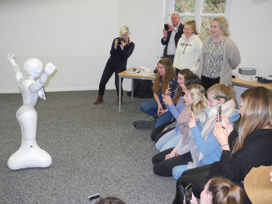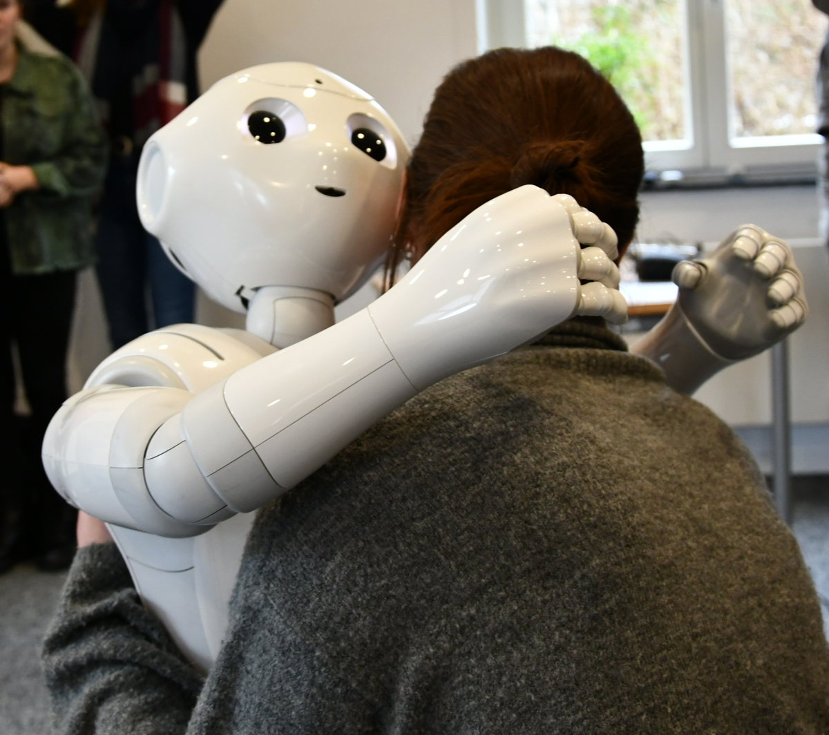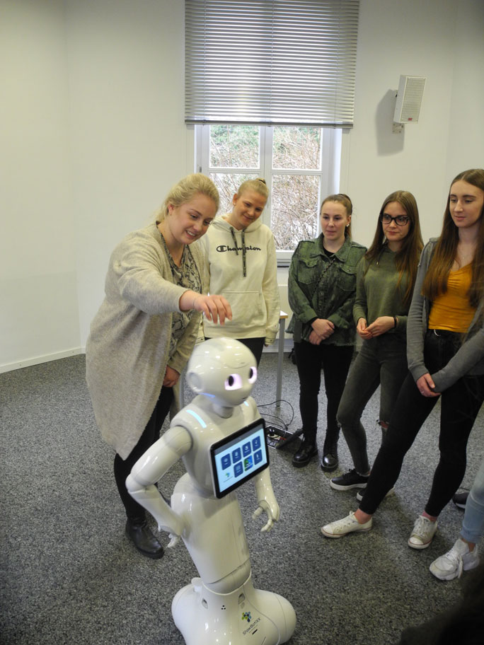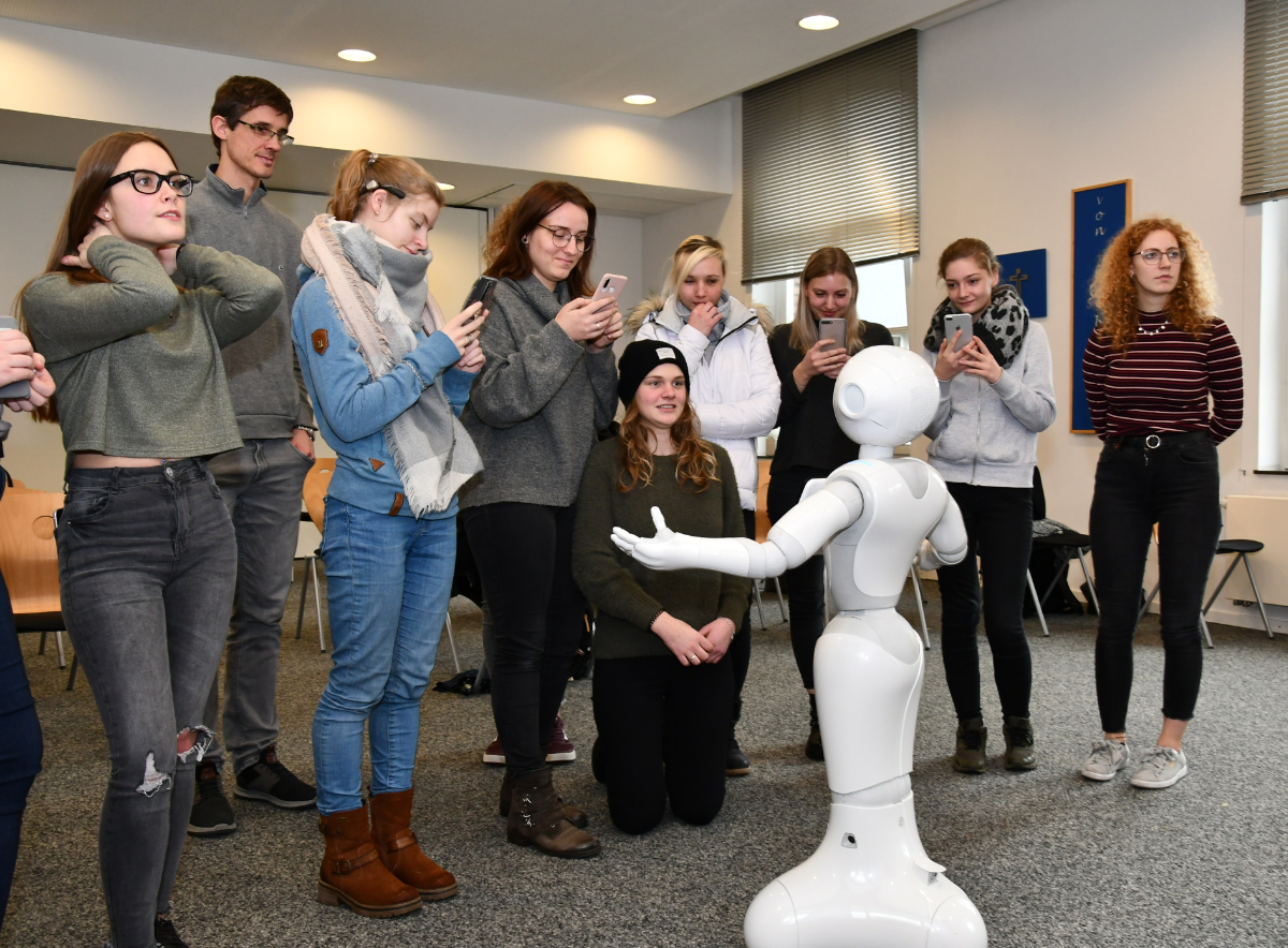 Fotos: Die Studierenden am Liebfrauen-Berufskolleg beschäftigten sich intensiv mit dem Roboter Pepper – Selfies und Umarmung gehörten dazu, aber auch die kritische Auseinandersetzung.