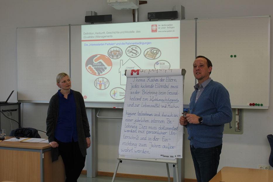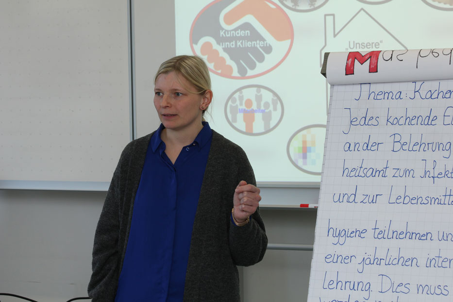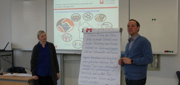 Nach Definitionen, theoretischen Grundlagen und Zusammenhang zwischen Aufbau- und Ablauforganisation referierten Herr Matzke und Frau Hesse in ihrem sorgfältig ausgearbeiteten Vortrag zur Herkunft und Geschichte von Modellen des (Qualitäts-)Managements, erläuterten was ein Qualitätsmanagementsystem überhaupt ist und thematisierten die so genannten Schnittstellenprobleme, wozu die Teilnehmer/innen aus ihren verschiedenen Praktika so manche Beobachtungen beisteuern konnten und rasch merkten, dass das Thema eine große Relevanz für ihren Berufsalltag hat, weshalb es wichtig ist, sich diesbezüglich Wissen anzueignen und vor allem Kompetenzen zu erwerben. Hierzu zählt auch, den PDCA-Zyklus des immerwährenden Kreislaufverhaltens von Planen, Handeln, Kontrollieren und Reagieren zu kennen, um ein immer höheres Qualitätsniveau bezüglich Effizienz sowie Kunden- und Mitarbeiterzufriedenheit zu erreichen.