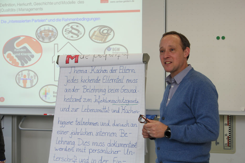 Schon am Anfang wurde klar, dass Qualität unterschiedlich bewertet wird. So wurden Antworten gegeben wie „Qualität ist, wenn unsere Einrichtung als UNSERE erkennbar ist“, „wenn die Mitarbeitenden zufrieden sind“, „wenn gesetzliche und behördliche Anforderungen erfüllt sind“, „wenn die Klienten zufrieden sind“ usw. Hieran wurde erkennbar, dass jeweils die verschiedenen Blickrichtungen der Beteiligten eine erhebliche Rolle spielen. Wie bei einem qualifizierten Seminar zu erwarten, blieb es aber nicht bei einer Abfrage individueller Sichtweisen, sondern die fachlich fundierte Definition wurde selbstverständlich ergänzt. Qualität definiert sich als „der Grad der Übereinstimmung zwischen Erwartungen (Soll) an eine Leistung und deren Eigenschaften (Ist)“, wie die Teilnehmer/innen erfuhren.