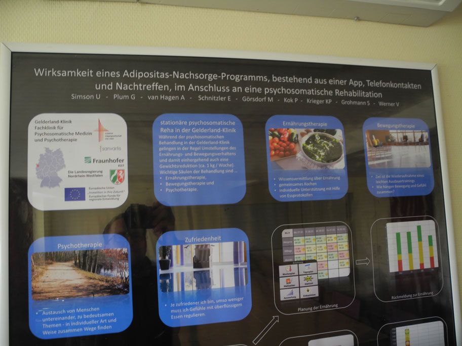 Doch die Gelderland-Klinik hat noch einiges mehr zu bieten. Sie verfügt über eine Lehrküche, wo gemeinsam gekocht wird. Mit diesem therapeutischen Angebot soll den Patienten, vor allem den von Binge-Eating-Betroffenen, bei einer Veränderung des Lebensstils geholfen werden. Besonders ins Auge fiel uns hier das auf die besonderen Bedürfnisse von adipösen Patienten abgestimmte Mobiliar (siehe Foto), sprich die extrabreiten Sitzflächen der Stühle. Außerdem gibt es eine eigene Sporthalle, ein Schwimmbecken und eine große Außensportanlage, welche von den Patienten im Rahmen der Therapien, aber auch in der freien Zeit genutzt werden darf. Auch den Mitarbeitern stehen die Sportanlagen zu Verfügung. Aufgrund der nahen Anbindung zum St. Clemens-Hospitals ist es auch für Dialyse-Patienten möglich, in der Gelderland-Klinik stationär aufgenommen zu werden. Es gibt darüber hinaus Programme zur Reha-Nachsorge und berufsbezogene Programme, um den Patienten, nach ihrem Aufenthalt, eine Wiedereingliederung in den Alltag zu vereinfachen.