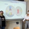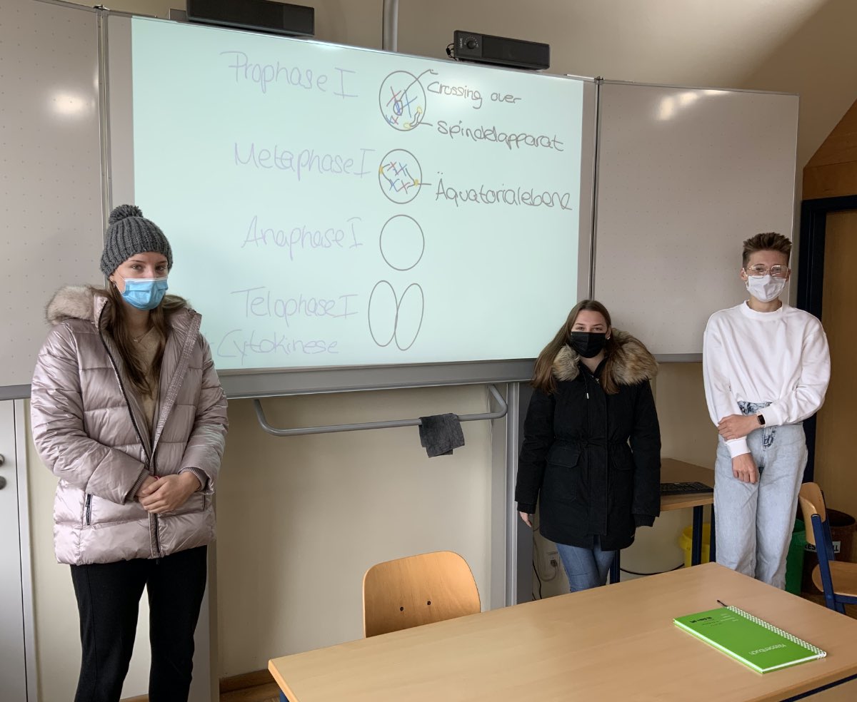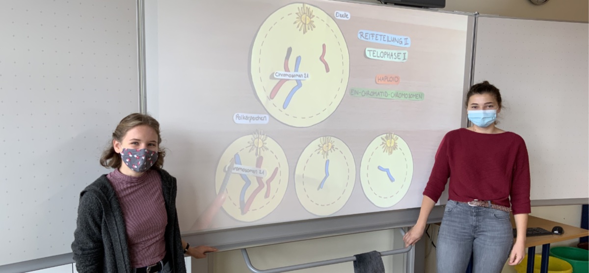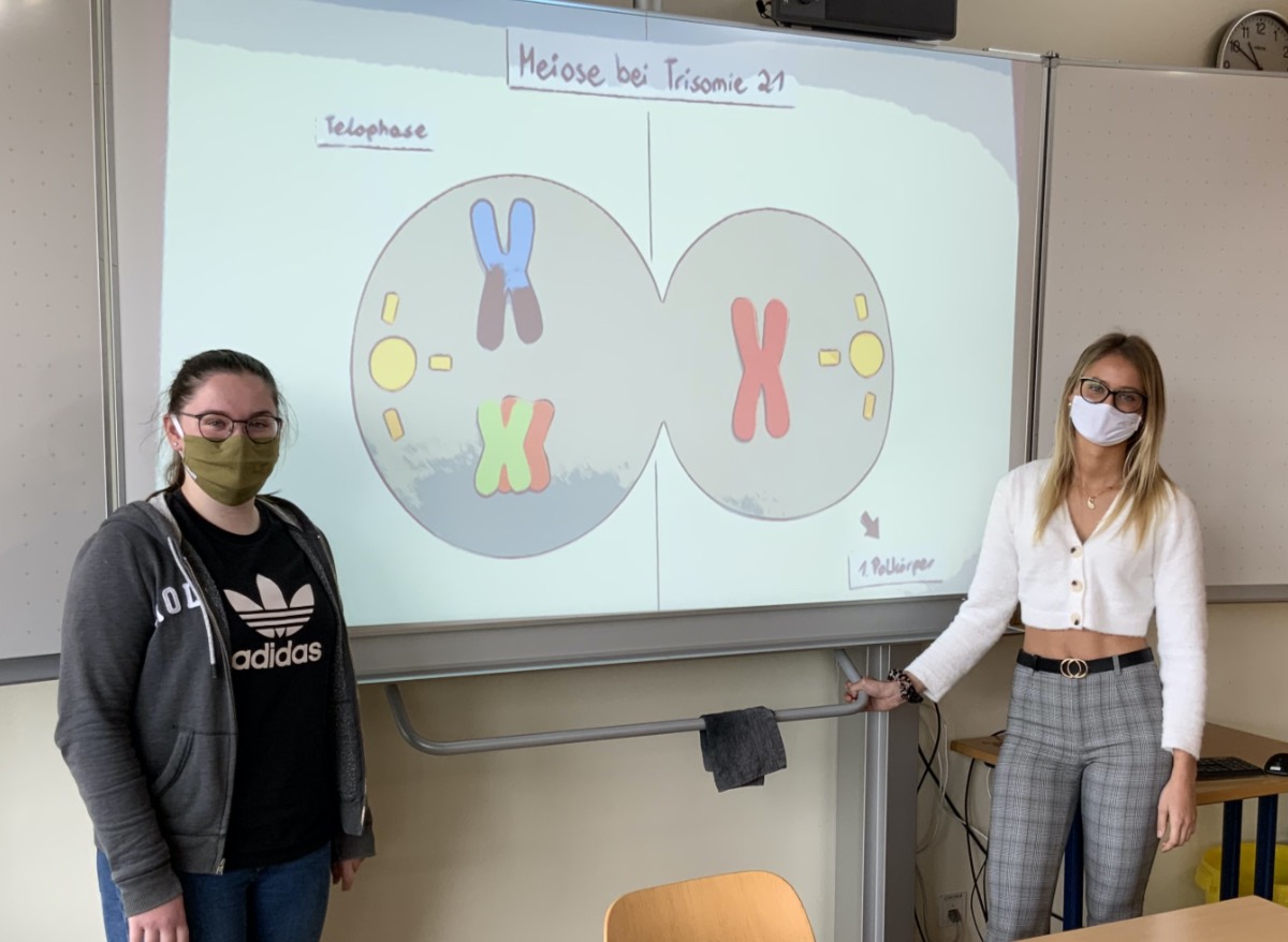 Exakt mit dieser Frage beschäftigten sich die Schülerinnen und Schüler des Leistungskurses Biologie der AH/13S1. Nachdem sie sich im Unterricht mit der Bildung der Keimzellen (Stichwort Meiose) beschäftigt hatten, läuteten sie eine Kreativphase ein. Das Thema: Wie kommt es genetisch bei der Bildung von Eizelle bzw. Spermium zu einer Chromosomenfehlverteilung, so dass nach einer Befruchtung in der Zygote, also der befruchteten Eizelle, das 21. Chromosom einmal zu viel da ist? Das wiederum hat zur Konsequenz, dass alle daraus entstehenden Zellen ebenfalls dieses eine Chromosom zu viel aufweisen.