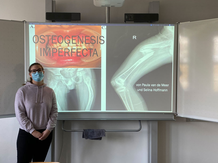 Am 28.10. war es dann soweit, wir hielten unseren Vortrag über die Osteogenesis imperfecta, abgekürzt auch OI. Die Osteogenesis imperfecta ist eher unter dem Begriff „Glasknochenkrankheit“ bekannt. Die OI ist eine Erbkrankheit, bei der die Knochen leicht zerbrechlich sind und diese im Röntgenbild eine glasige Struktur aufweisen. Als Betroffenen der OI luden wir Herr Rouven Dalmer in die Schule ein. Coronabedingt entschieden wir uns dazu, auf einen Besuch vor Ort zu verzichten. Jedoch war er so freundlich und hat sich die Zeit genommen und sich für uns die Mühe gemacht, ein Video zu drehen.