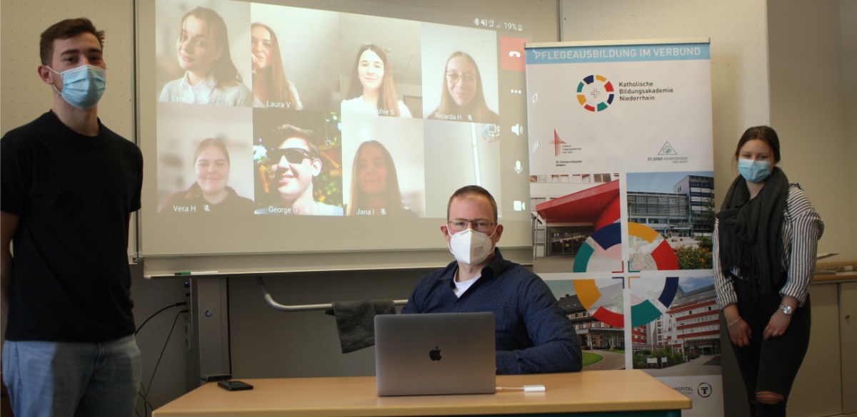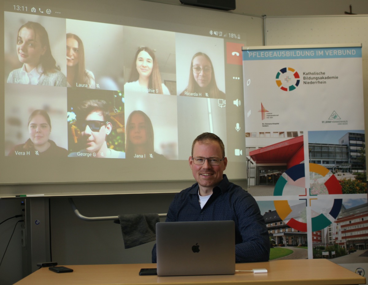 Einen neuen Weg beschritt nun die Liebfrauenschule Geldern. Andreas Mäteling, neben Gerhard Löffler und Niklas Roeling einer der drei Pflegelehrer der angehenden Fachabiturienten aus dem Schwerpunkt Gesundheit und Soziales, hatte mit André Geurtz, Akademieleiter der katholischen Bildungsakademie Niederrhein, einen richtigen Experten im Berufskolleg des Bistums Münster zu Gast. In früheren Jahren stellte sich dieser im Gespräch immer einzelnen Klassen. Coronabedingt saßen ihm nun aber rund 70 Schülerinnen und Schüler gegenüber – nicht im großen Konferenzraum der Schule, sondern via Videokonferenz.