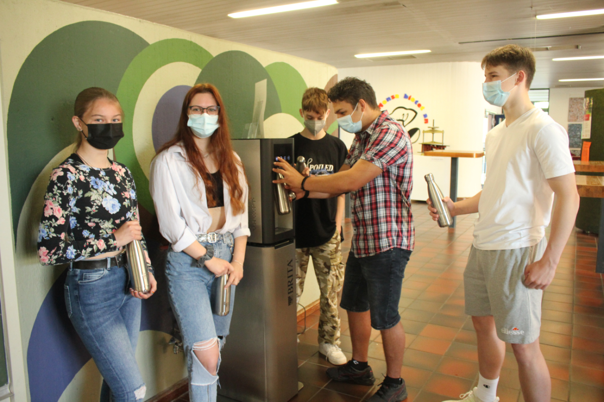 Der SV ist gerade dieser letzte Punkt wichtig, Nachhaltigkeit. Vor diesem Hintergrund entstand die Idee, Trinkflaschen zu organisieren. Seit dem letzten Jahr steht ein Wasserspender im PZ. Dieser soll nun stärker in den Fokus gerückt werden. Dadurch, so die Hoffnung von Schulleitung und SV, werden weniger Einweg-Flaschen benutzt und die Schule trägt weiter dazu bei, dass Nachhaltigkeit nicht nur durch Unterricht in die Köpfe gelangt. Jede*r kann durch das eigene Verhalten ganz einfach einen Beitrag leisten.