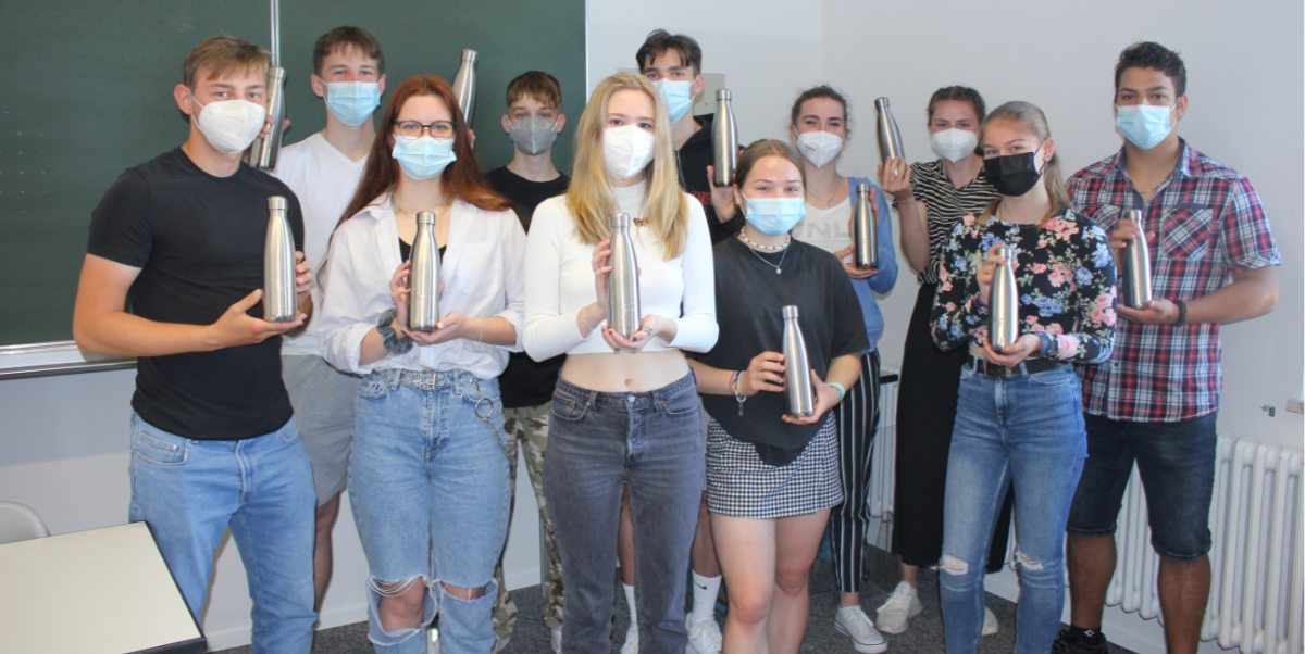 Dieser Satz muss nicht immer negativ sein. Ganz im Gegenteil. Die Schulleitung hat zusammen mit der Schülervertretung am 31.05.21 alle Lernenden im „normalen“ Präsenzunterricht mit einem Willkommengeschenk begrüßt – einer Edelstahltrinkflasche mit dem Schullogo.